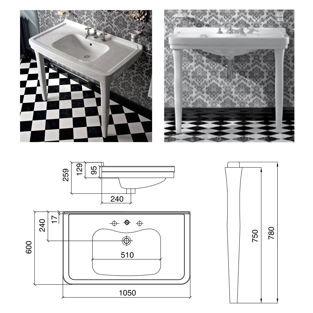 The washbasin top is equipped with upstand, with 1 or 3 tap holes (specify the number of holes required when ordering), and is 1050 mm long.