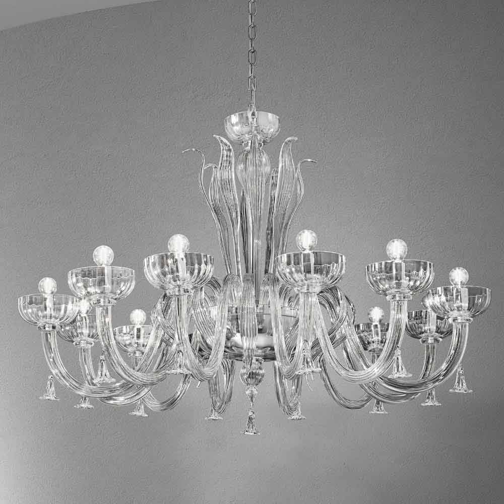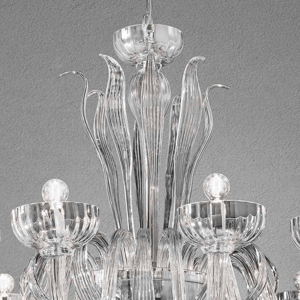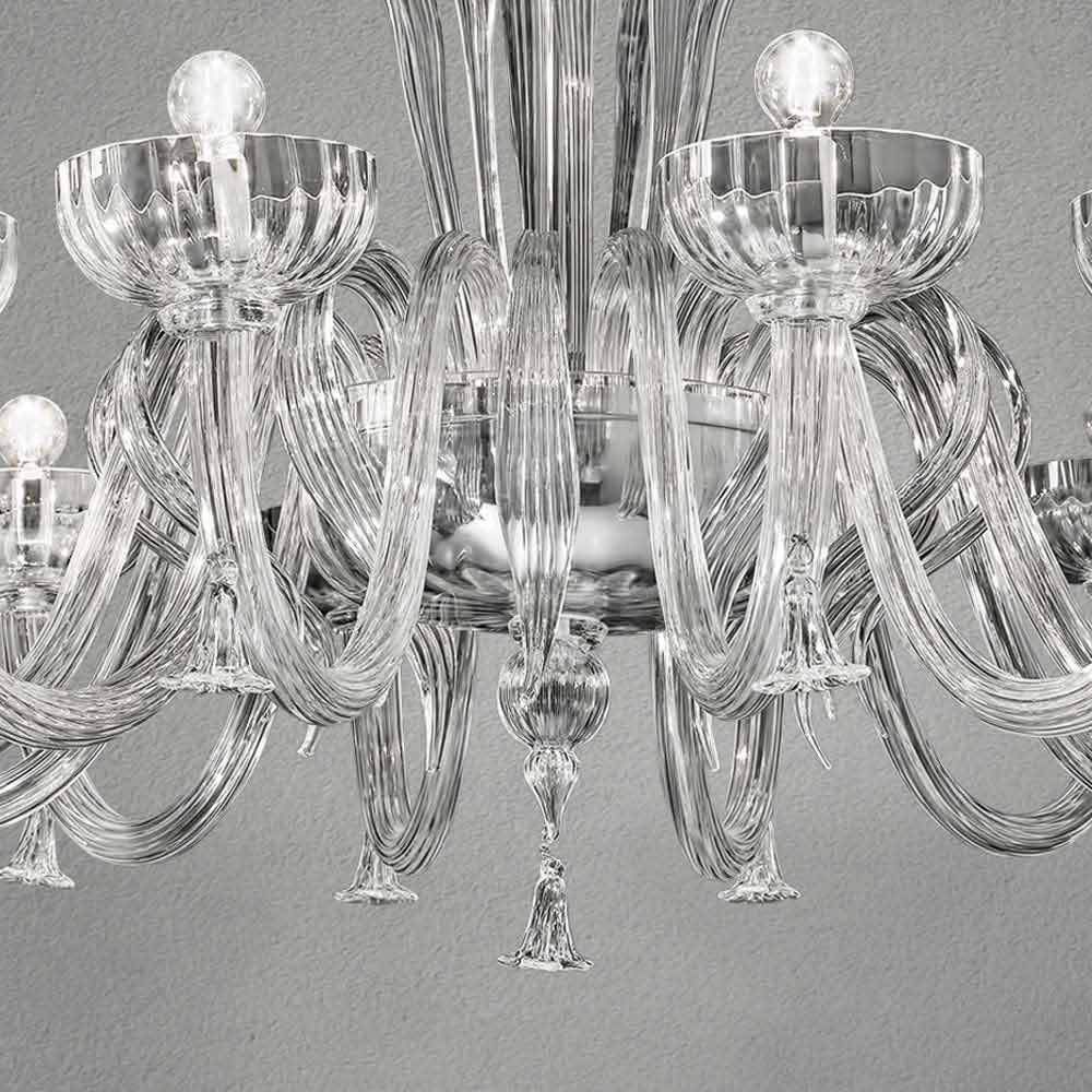 Refined chandelier with a classic design handcrafted in Italy, in Venice, in crystal finish glass with details in polished chrome metal . Conceived and designed to give light to large spaces such as entrances, living rooms or dining rooms, this wonderful and elegant piece of furniture is able to characterize any environment bringing with it a majestic touch of the past. Its aesthetic is made unique by the tapered arms embellished with completely hand-shaped hanging bells for a result of high quality and priceless value . The sober and elegant finish allows the chandelier to complete any environment with style and personality , from the most classic to the most modern, basing its furniture on a wonderful play of contrasts for an unprecedented result .