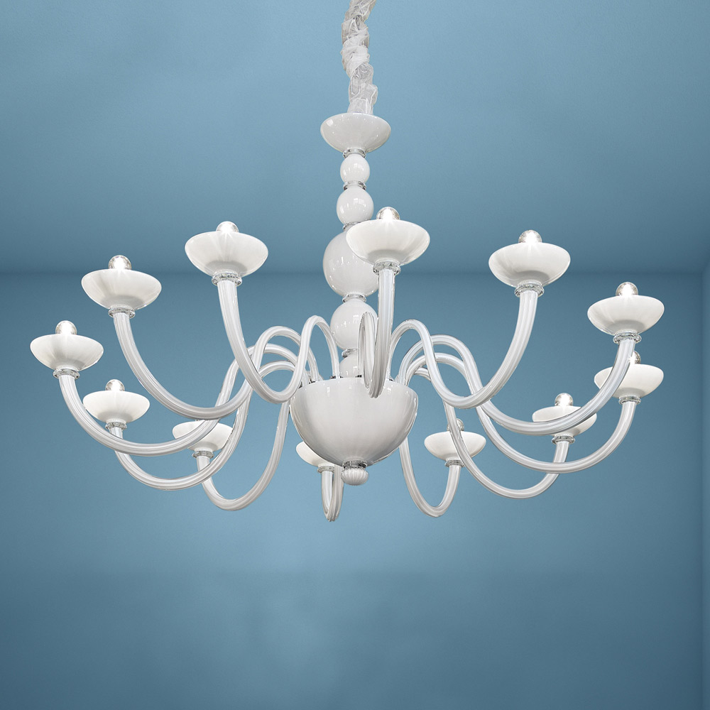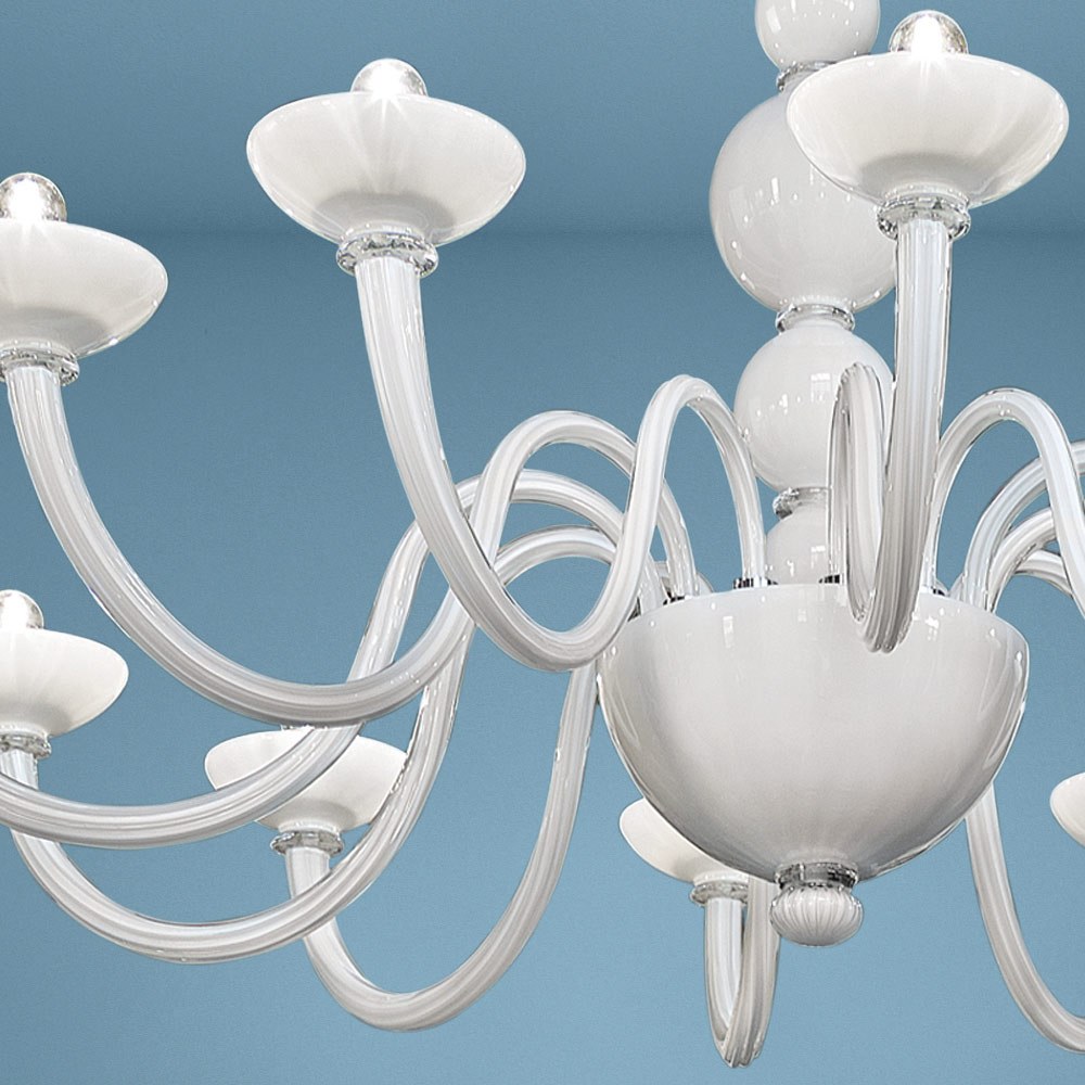 Handcrafted Venice glass chandelier in milk white crystal finish with details in polished chromed metal . A piece of furniture with an amazing and iconic presence characterized by a soft and delicate line and refined curves that adapt perfectly to classic environments but at the same time also to spaces with a contemporary style. The element of tradition is punctuated by its marvelous components in entirely hand-made blown glass which is transformed to update itself thanks to trendy colors. Its enveloping shapes make it an ideal element to occupy any environment, both domestic and contract, with class and dynamism .