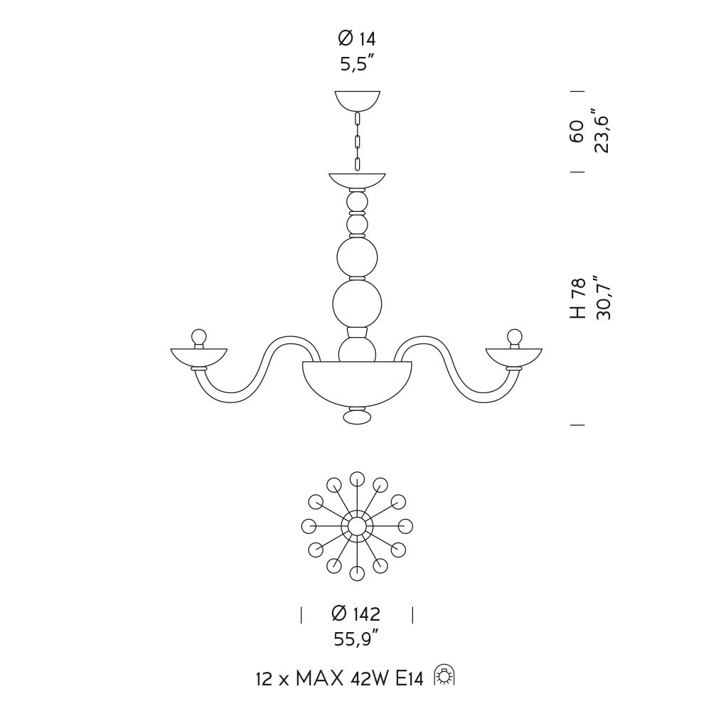 12 lights chandelier in hand blown Venice glass and metal Made in Italy.