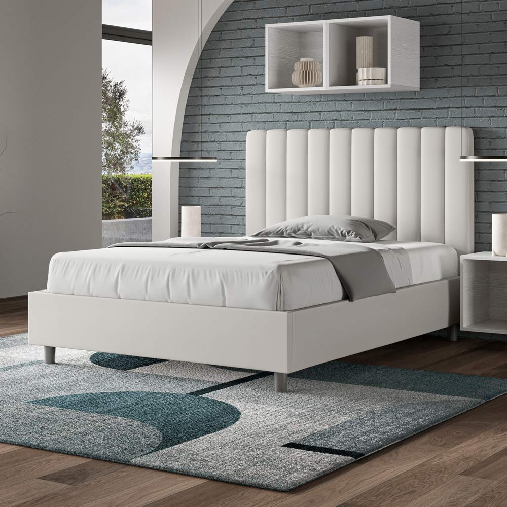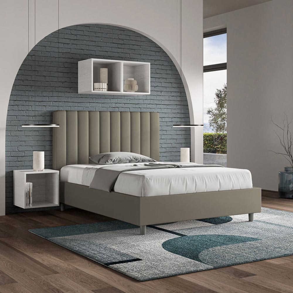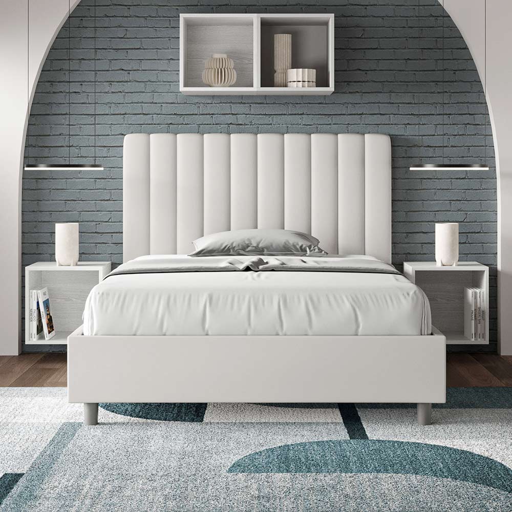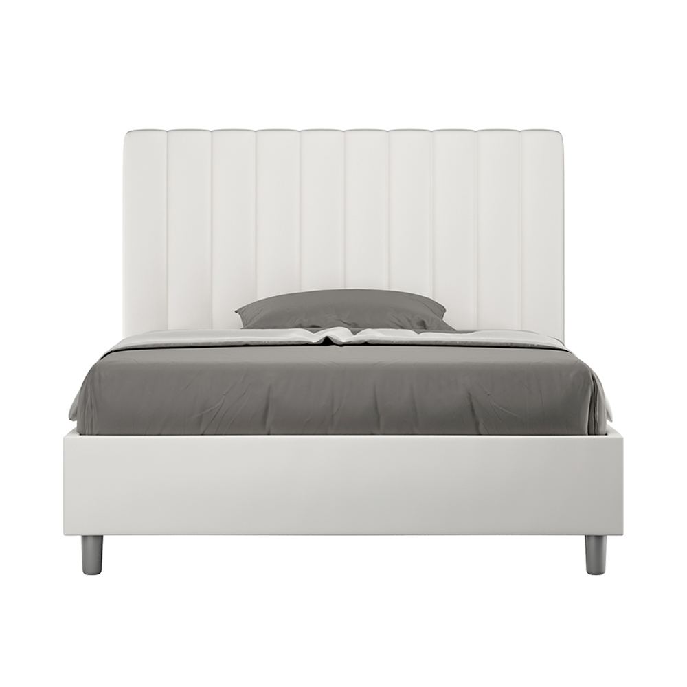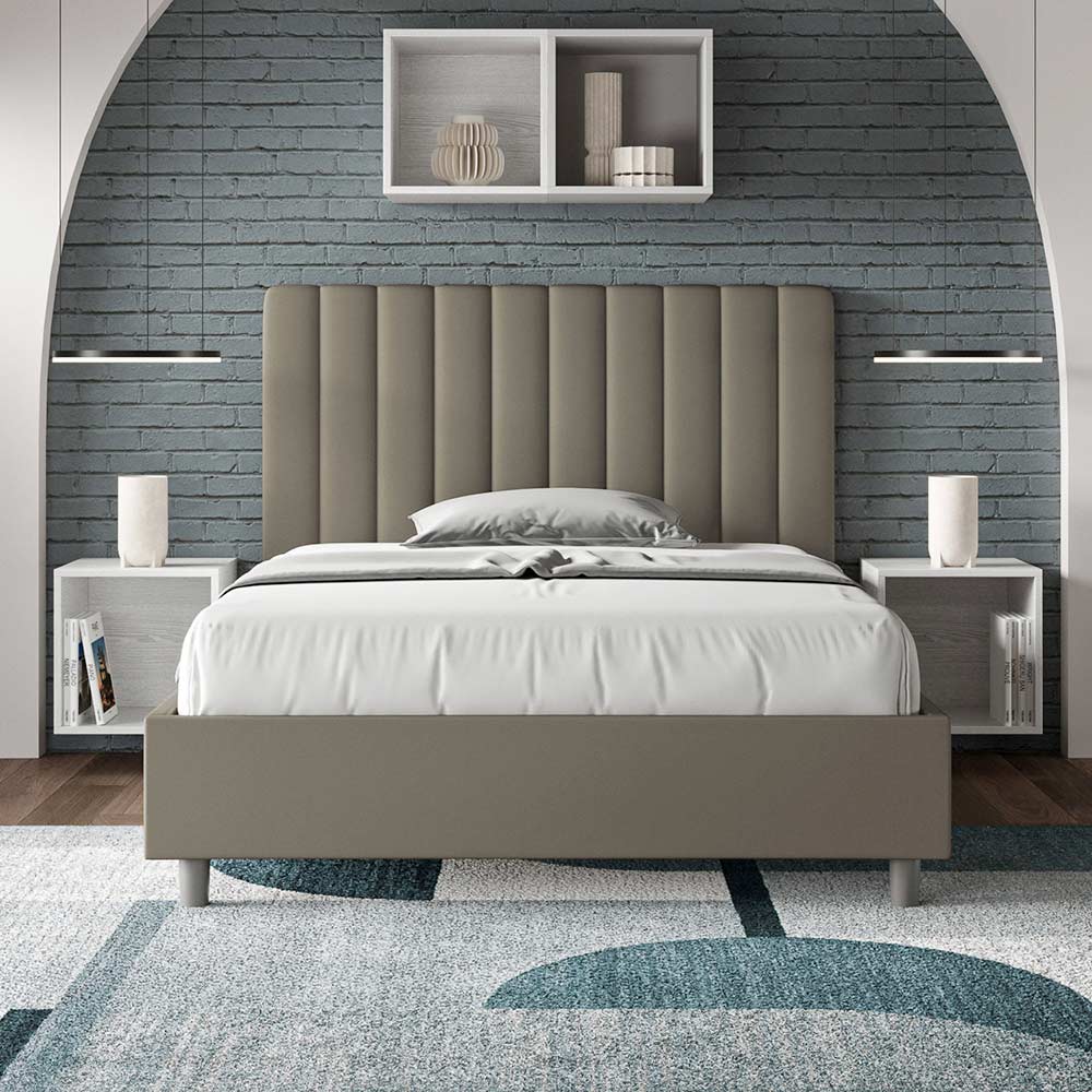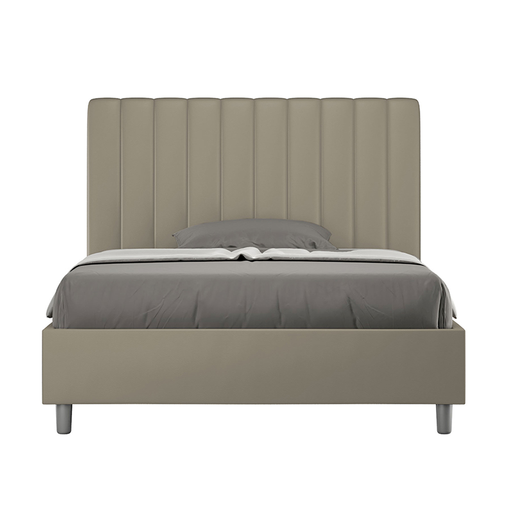 120x200 cm padded queen-size bed made of chipboard panels and covered in imitation leather , entirely Made in Italy. This queen-size bed with an upholstered bed frame is ideal for those seeking a statement piece without being overly overbearing. This bed boasts a minimalist headboard with a delicate quilted effect of symmetrical vertical lines , which fits beautifully in any setting, whether modern or classic. The faux leather upholstery adds a warm, welcoming feel to the room. It's particularly suitable for well-lit spaces, as the material retains its color even after prolonged exposure to sunlight.
