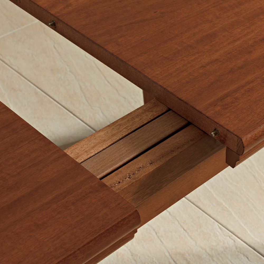 extendable dining table has a rectangular top in 25 mm thick