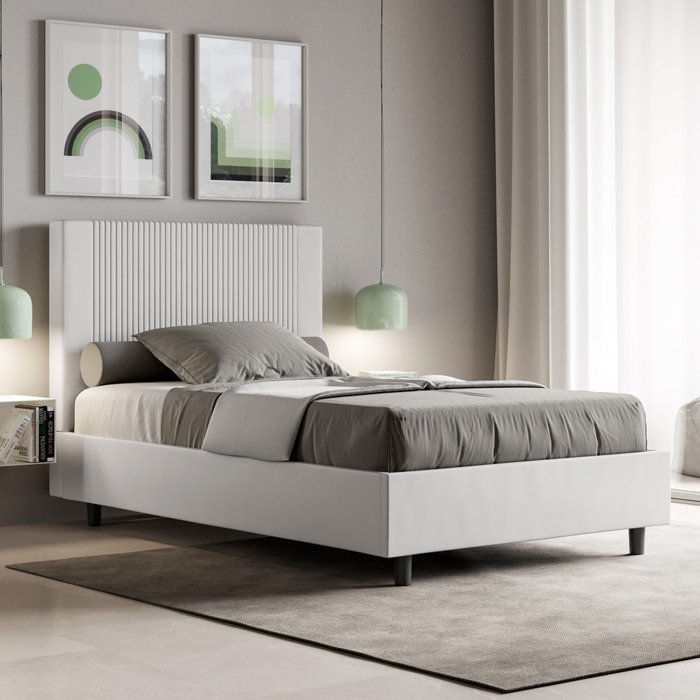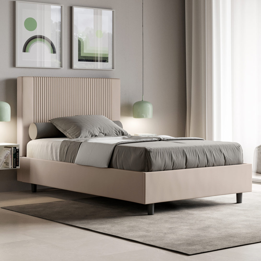 This French bed, with its padded bed frame, is a product of Italian manufacture made of faux leather. Its simple yet modern design is perfect for spaces distinguished by sophisticated elegance. The main feature of this model is its headboard, adorned with a vertical line motif , ideal for those who want to combine it with visually striking spaces with prominent walls, while maintaining an unmistakable elegance.