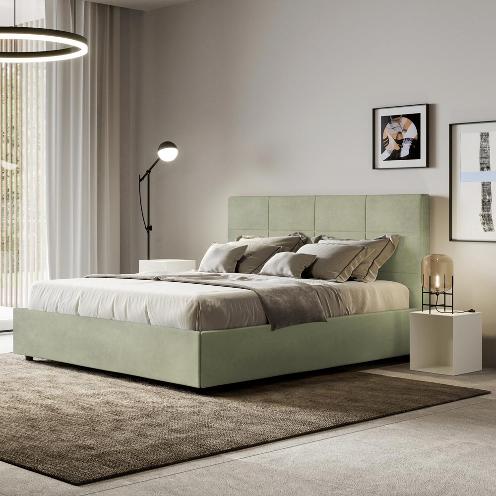 160x200 cm padded double bed made of chipboard panels and covered in microfibre , entirely Made in Italy. This bed, with its padded frame, is the perfect example of how elegance and comfort can be combined in a single piece of furniture. This model is characterized by its headboard enriched withRectangular geometric patterns . Covered in microfiber, it is easy to keep clean: just use a microfiber cloth for quick and effective cleaning.