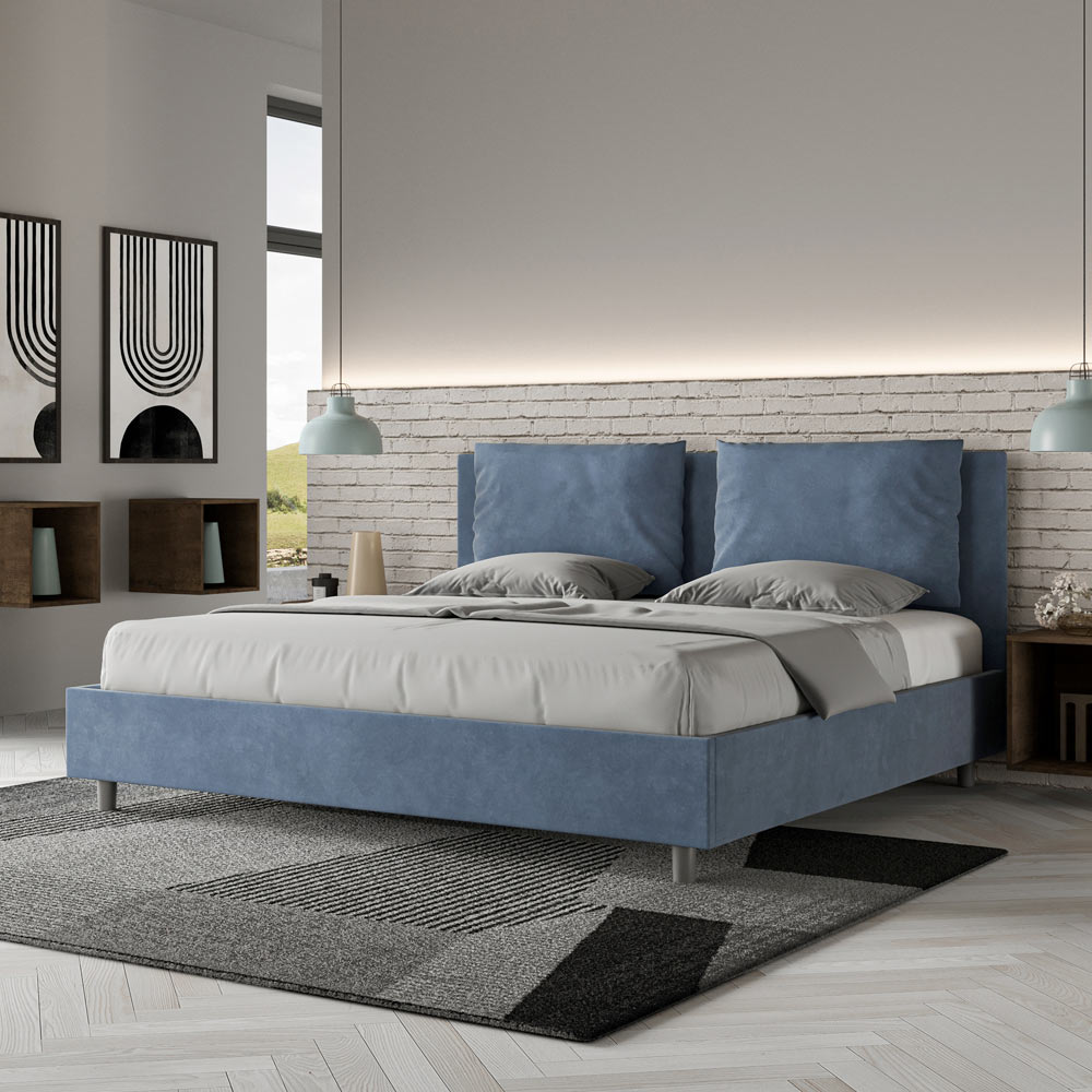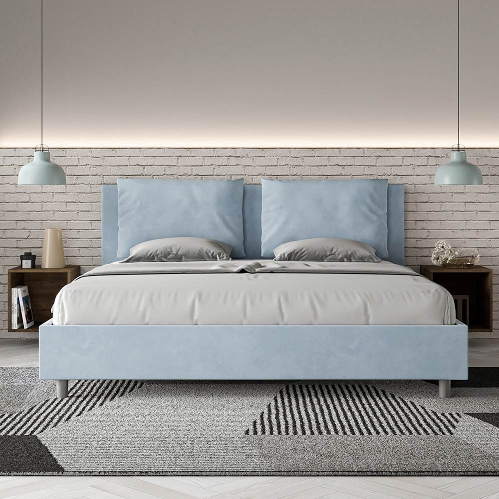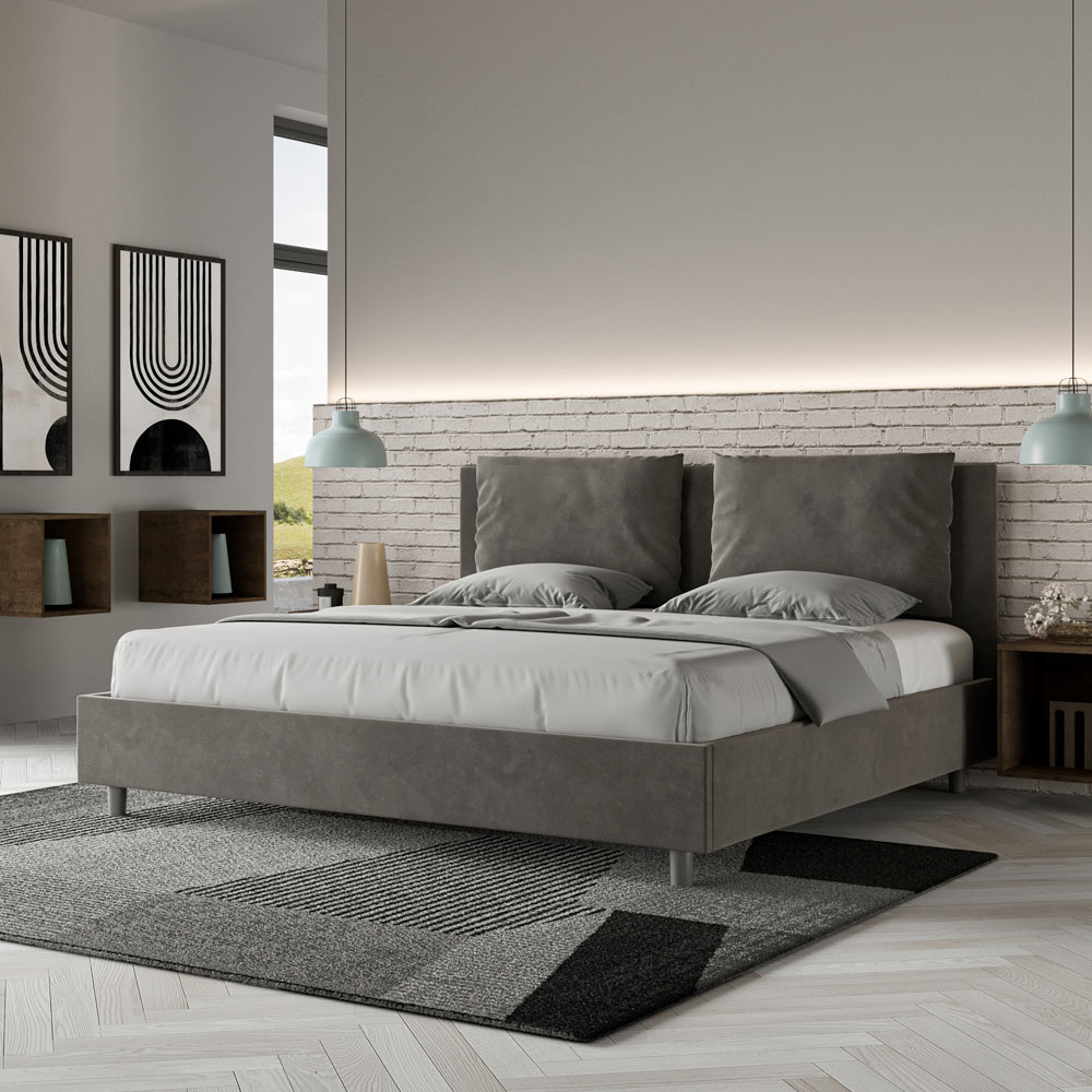 King size bed 190x200 cm padded made of melamine panels and covered in microfibre , entirely Made in Italy. This king-size bed with an upholstered frame perfectly embodies the advantages of an upholstered bed: comfort, contemporary style, functionality, and efficient use of space . This bed, with its wide- cushioned headboard , offers a relaxing corner ideal for reading or watching TV, enhancing your bedroom. Elegant and stylish, this bed is upholstered in microfiber, making cleaning quick and easy: simply wipe it with a microfiber cloth to keep it sparkling.