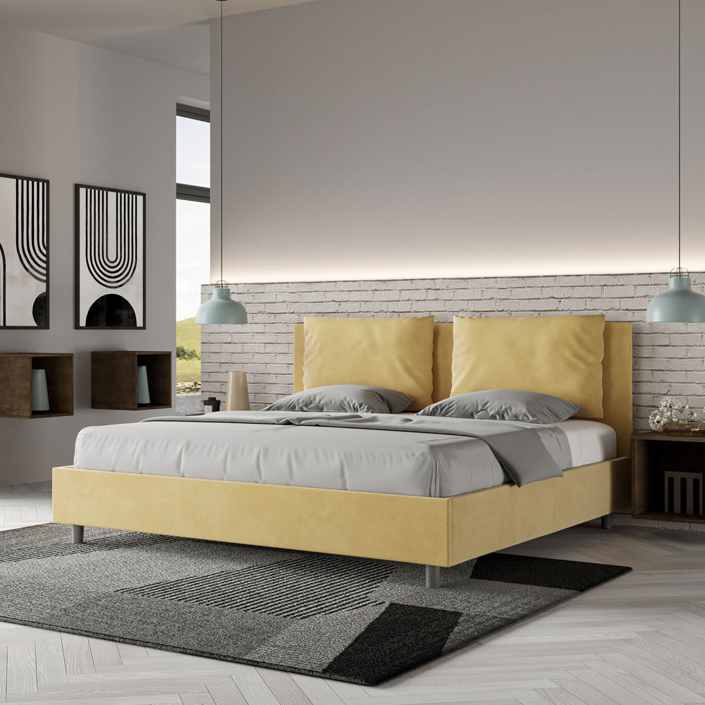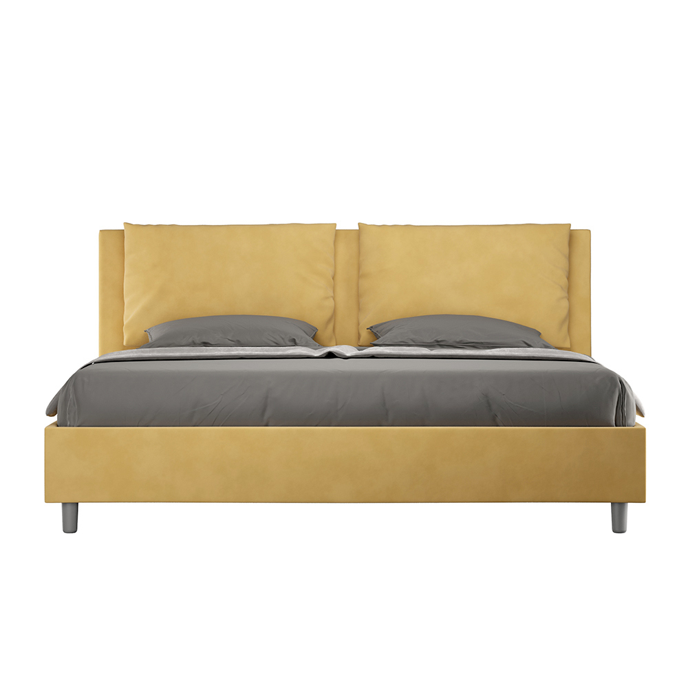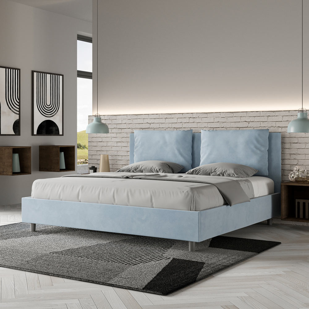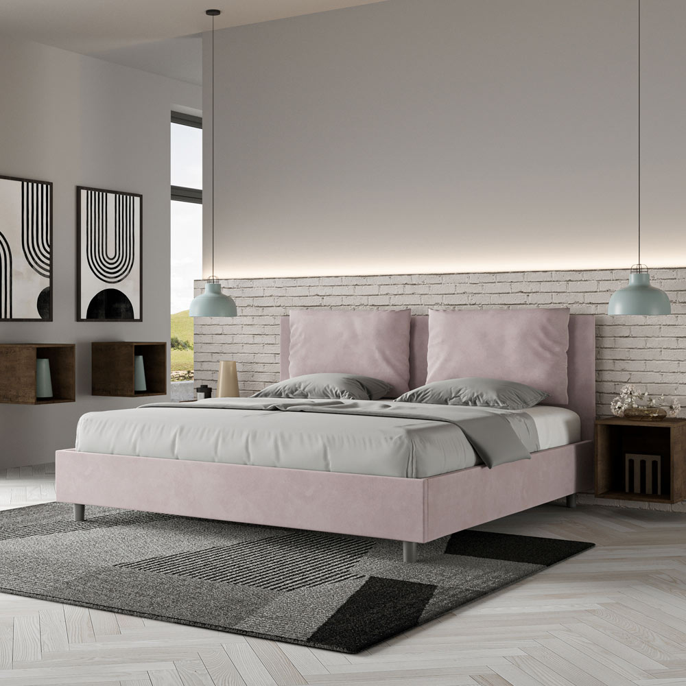 King size bed 190x200 cm padded made of melamine panels and covered in microfibre , entirely Made in Italy. This king-size bed with an upholstered frame perfectly embodies the advantages of an upholstered bed: comfort, contemporary style, functionality, and efficient use of space . This bed, with its wide- cushioned headboard , offers a relaxing corner ideal for reading or watching TV, enhancing your bedroom. Elegant and stylish, this bed is upholstered in microfiber, making cleaning quick and easy: simply wipe it with a microfiber cloth to keep it sparkling.