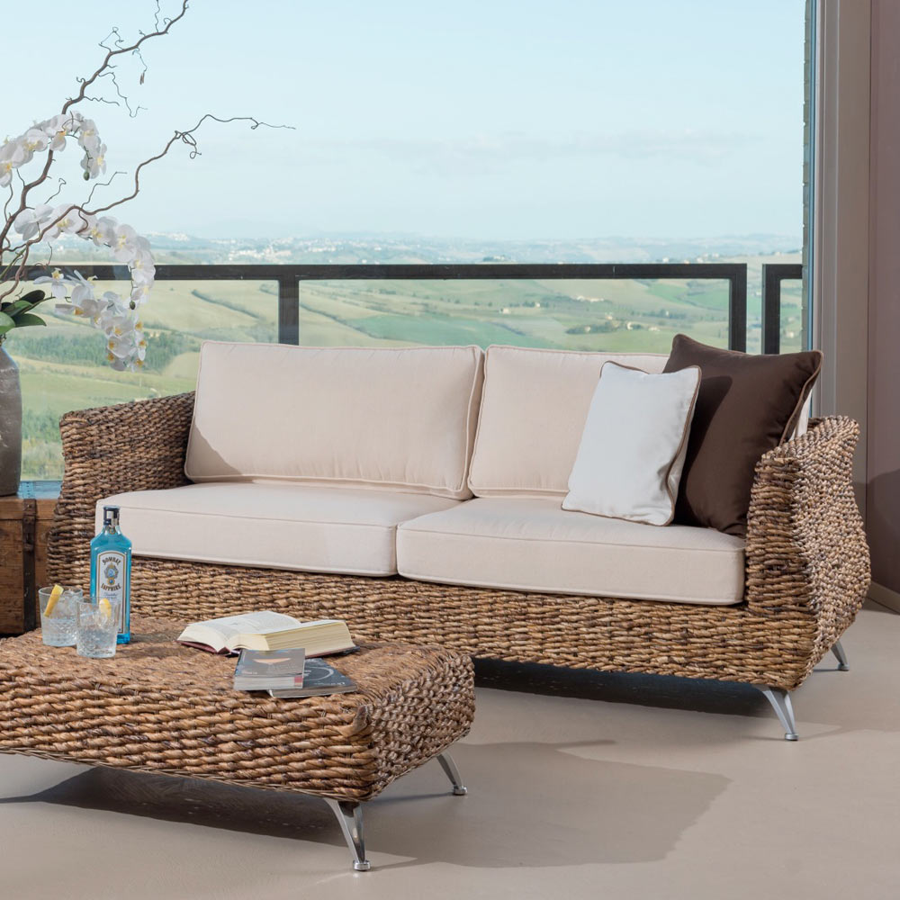 The sofa belongs to a whole collection which stands out for its modern tones both in the design of the seats and in the detail of the aluminum legs . At the same time, however, it is animated by the warmth of the natural weave , handmade using a refined natural banana braid.