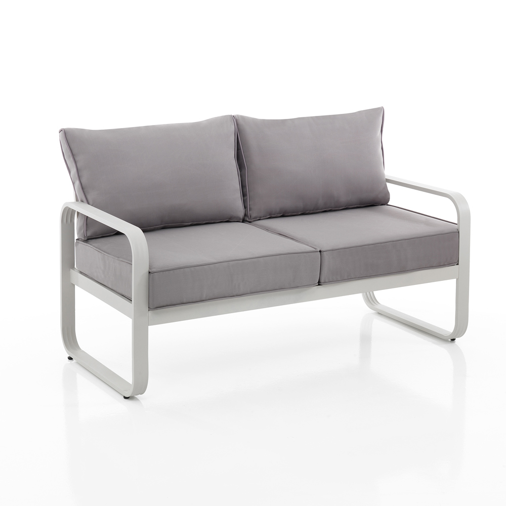 This two-seater sofa is the emblem of minimalist comfort for outdoor spaces . Its clean lines and aluminum structure offer a modern and captivating aesthetic that adapts with versatility to both modern gardens and more classic style terraces.