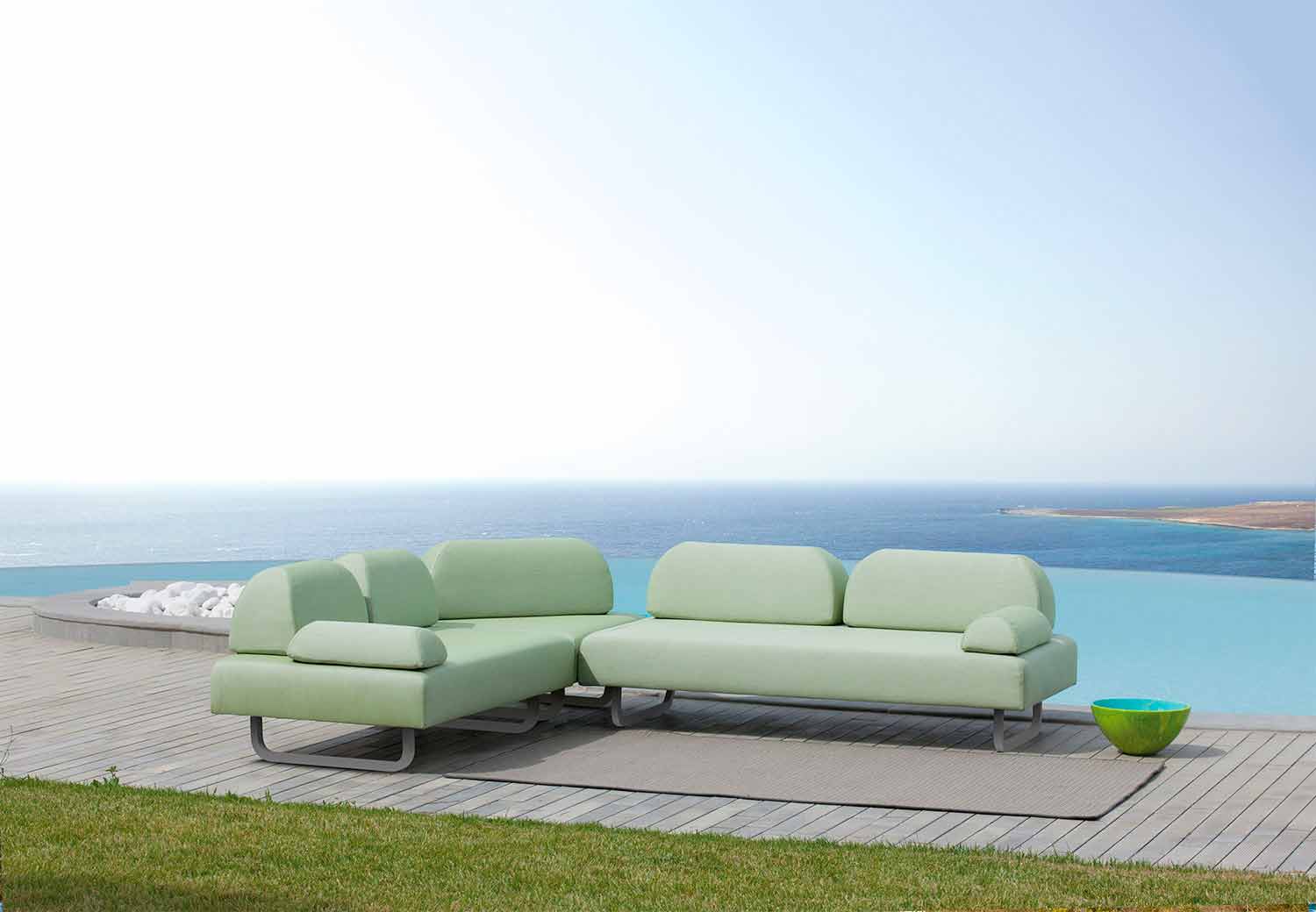 The feet are instead made of powder-coated galvanized iron painted with thermosetting powder in a matt finish. Ideal for outdoor but also indoor environments, the sofa includes two cushions that can be positioned as desired, making the product versatile and modular.