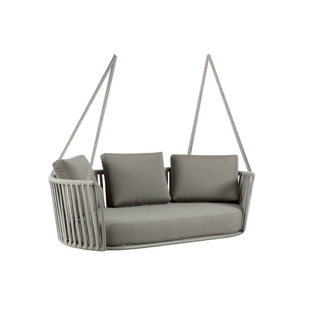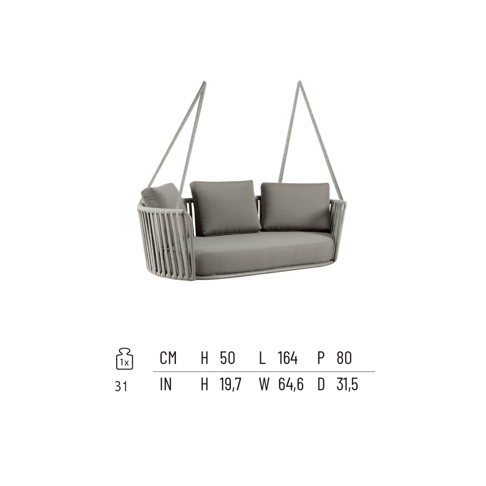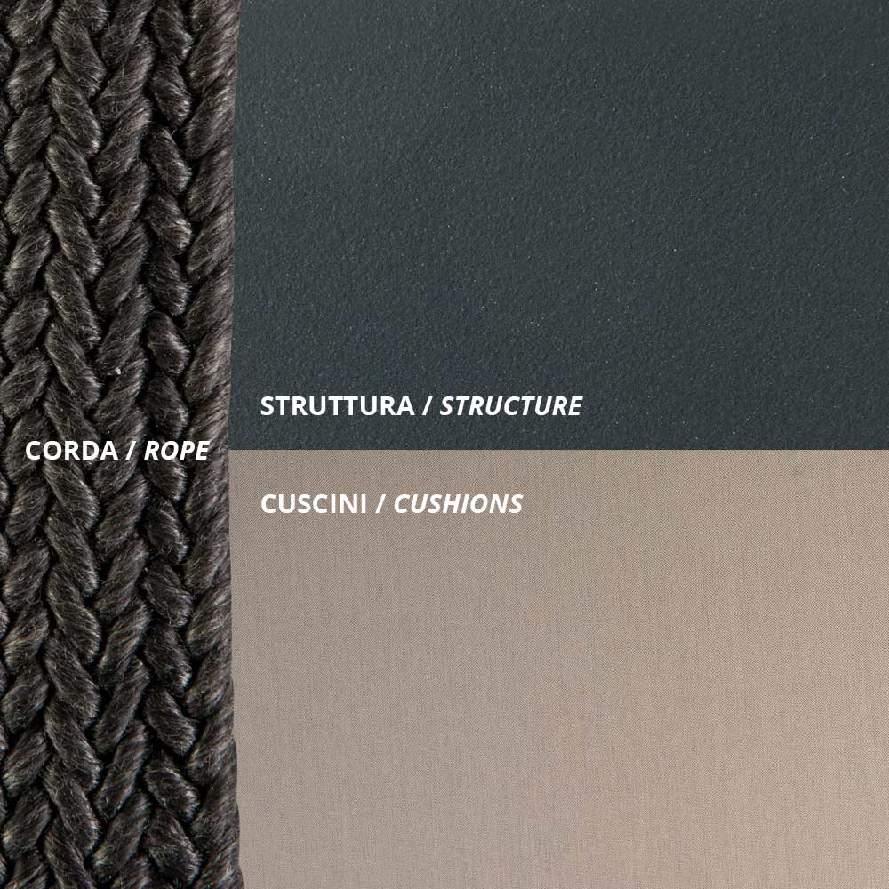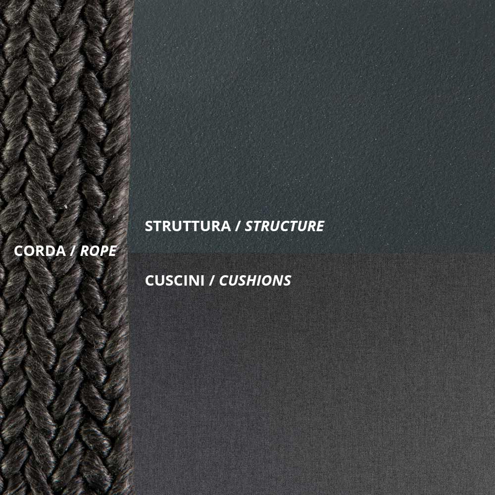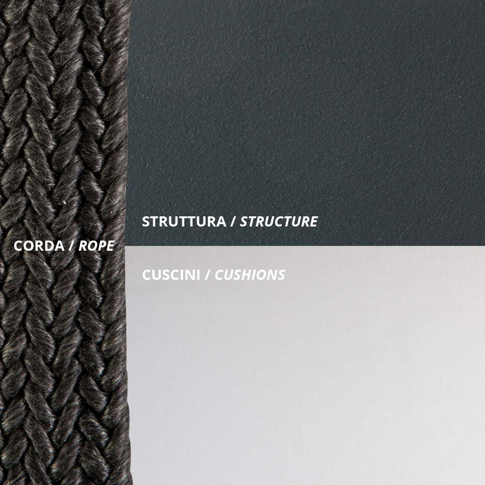2-seater garden swing entirely made in Italy with a powder-coated galvanized iron structure painted in antique gray and black rope and a seat covered in 100% polypropylene fabric . Lightness and strength come together to create a casual and particular piece of furniture characterized by an original and refined design. The large and ergonomic seat together with the welcoming and harmonious shape allows for optimal comfort while the elegant combination of selected materials gives the aesthetics of the product a refined character and a contemporary style .
