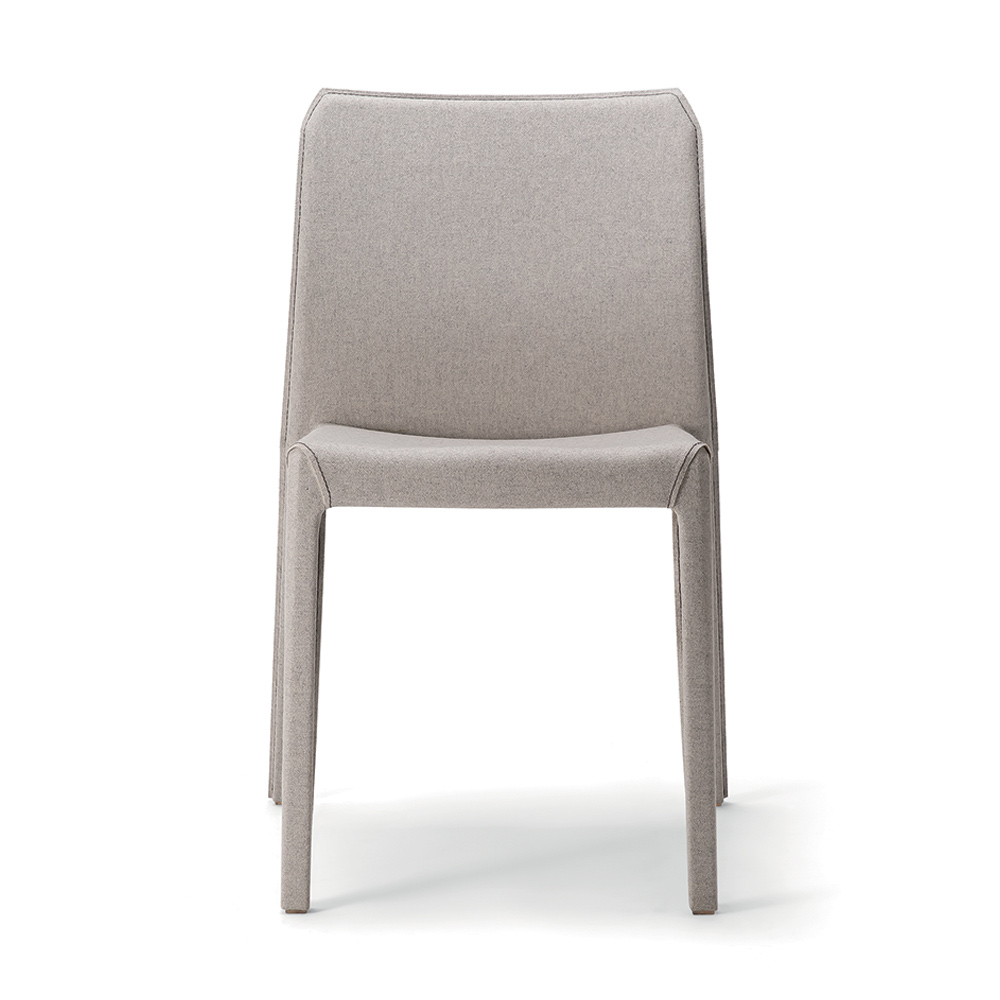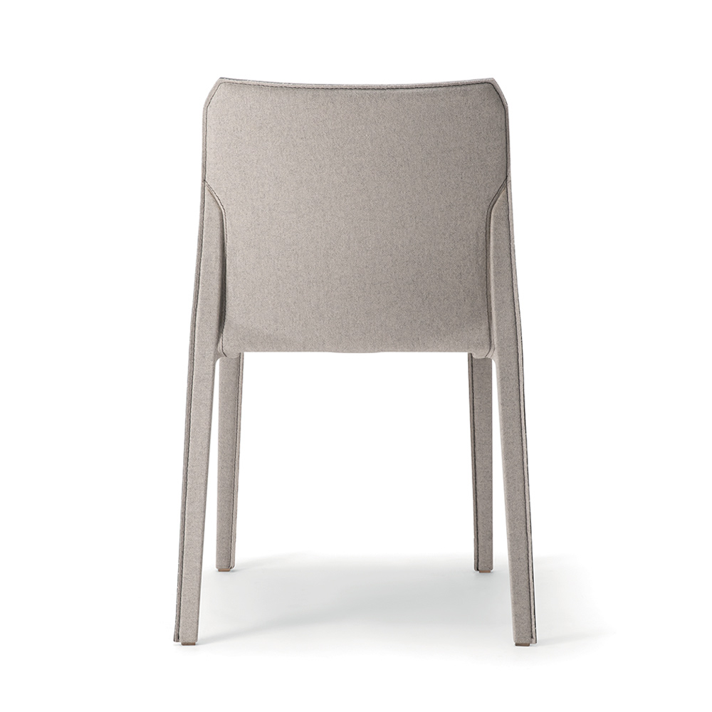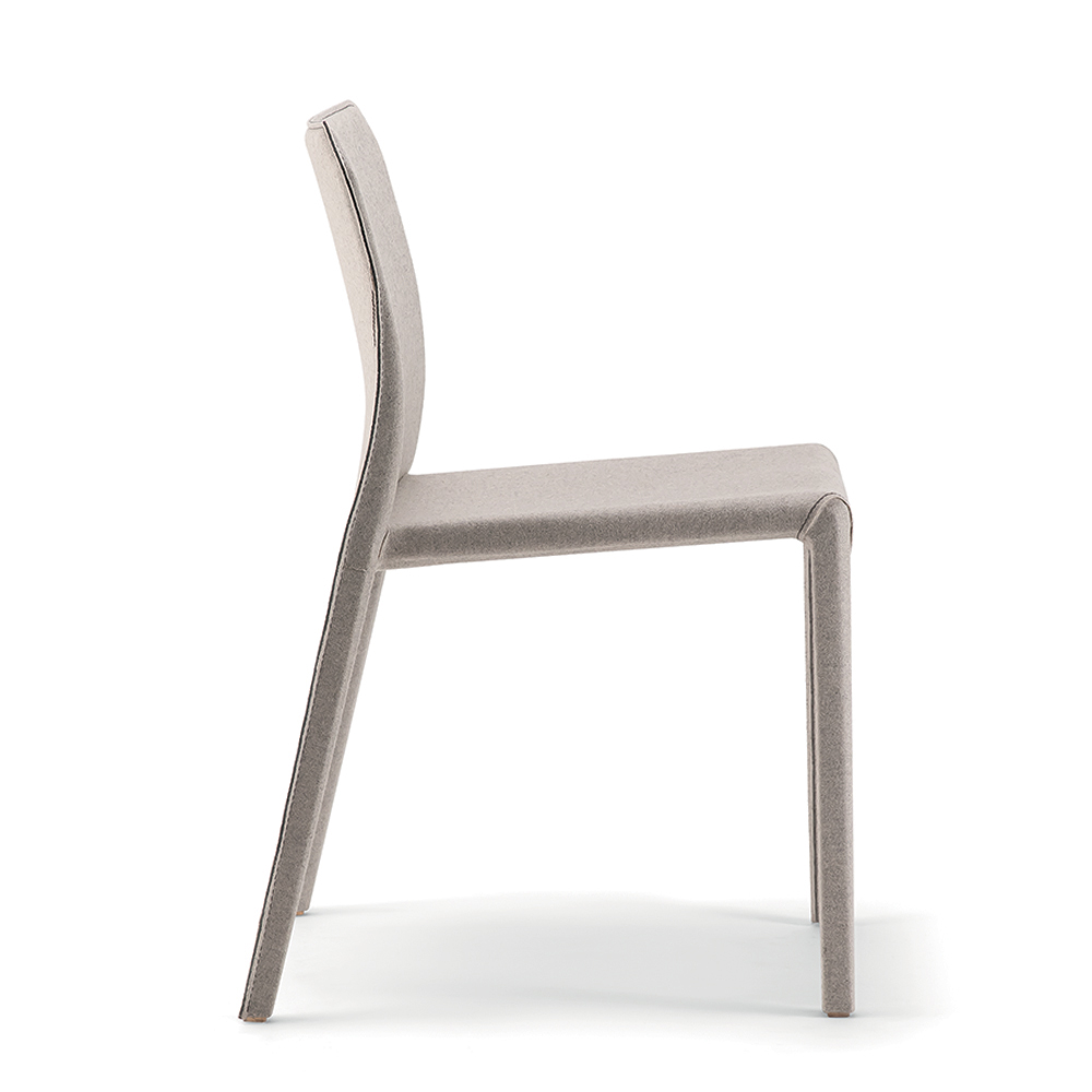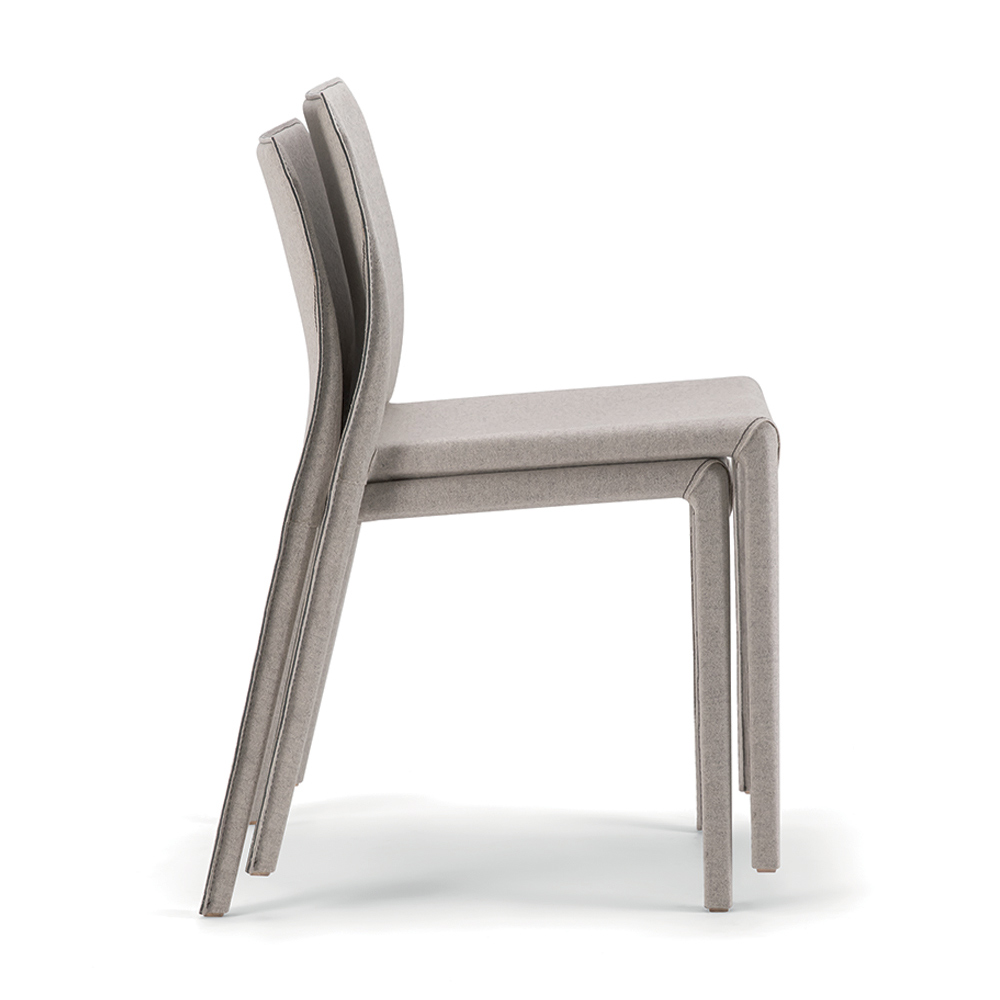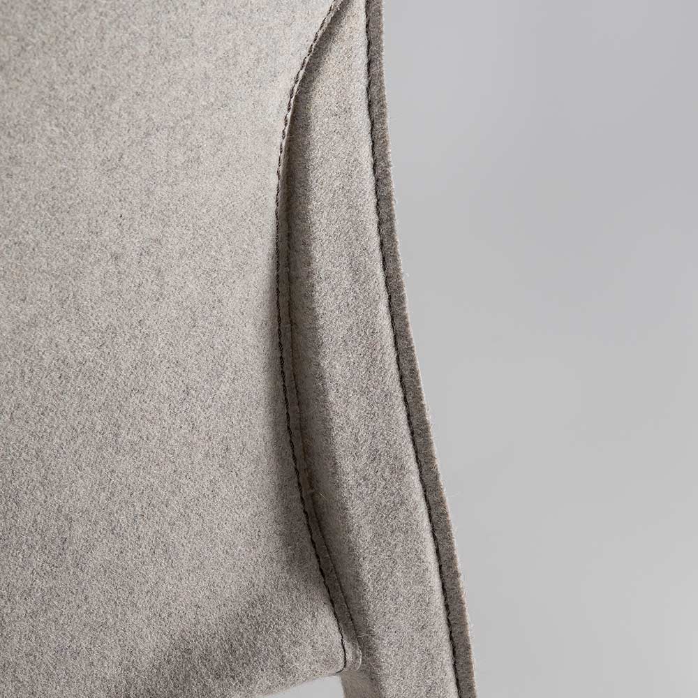 2 Dining chairs made with a monocoque structure in polypropylene reinforced with glass fiber and covered in light gray regenerated wool .