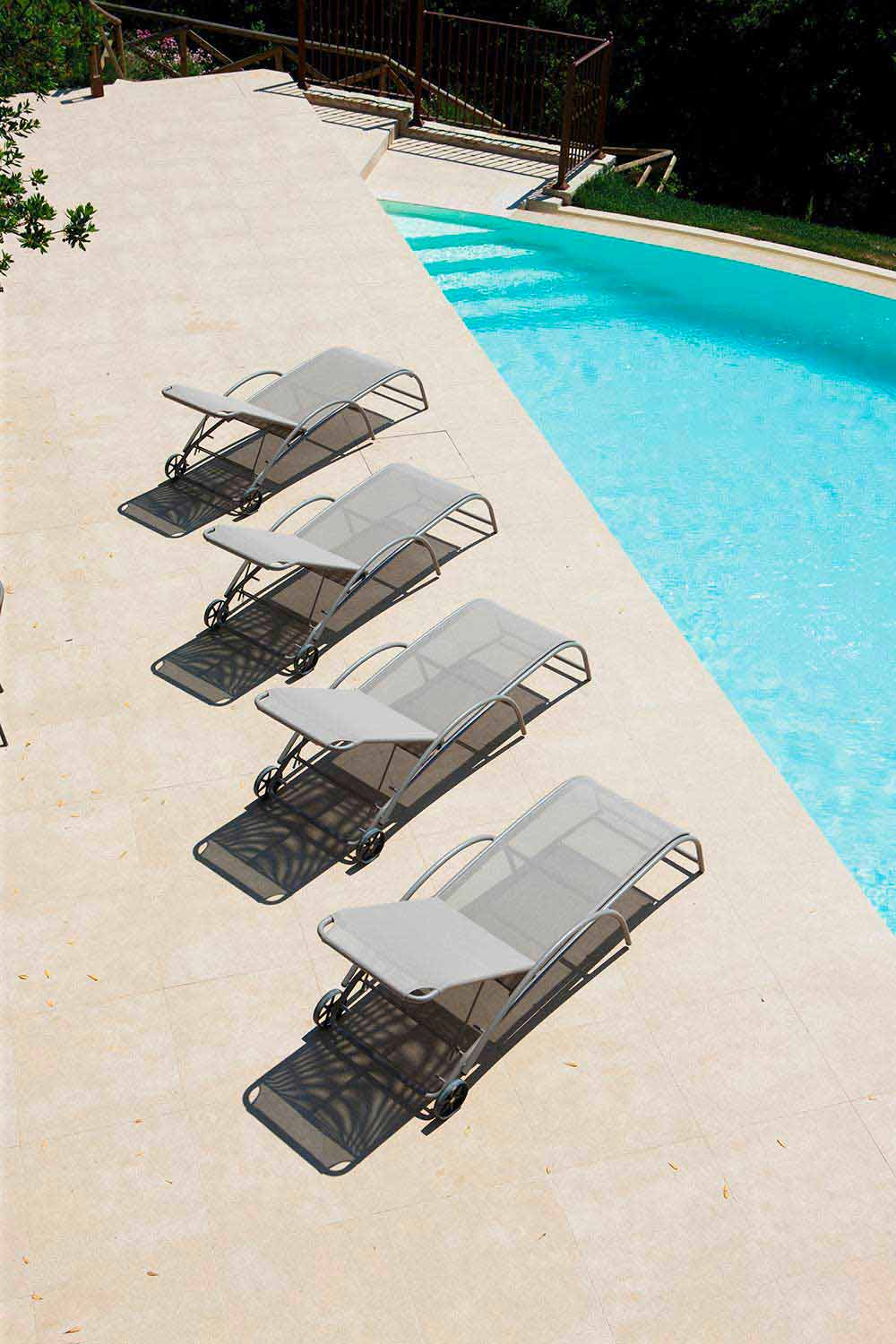 Designer outdoor chaise longue in powder-coated galvanized iron and fabric with wheels Made in Italy, 2 pieces.