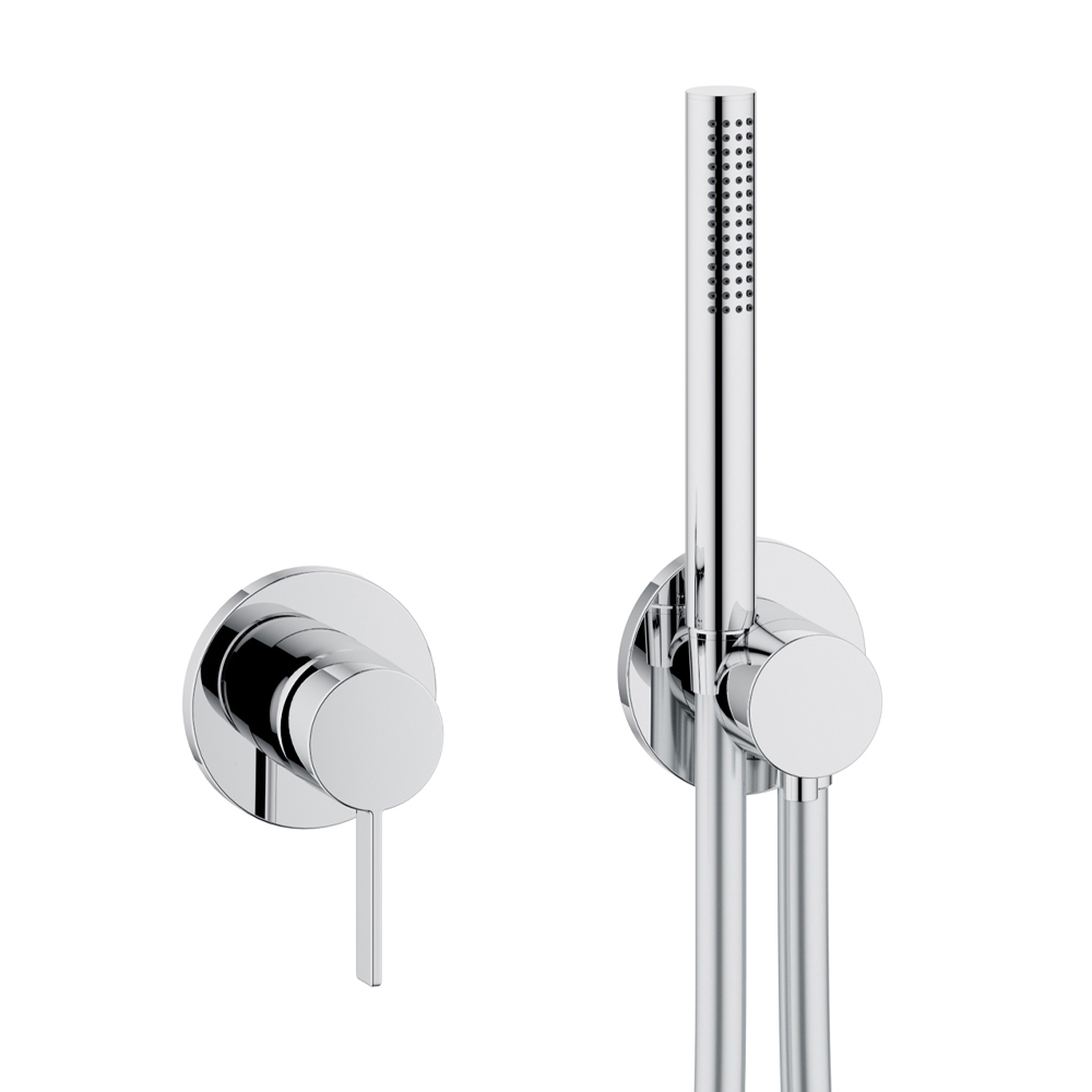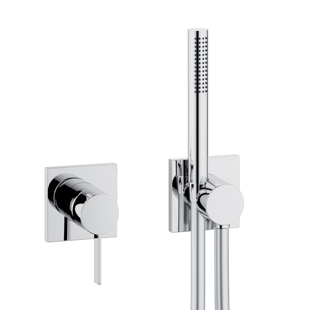 This internal shower unit with two-way installation with single-lever mixer, hose connection, hand shower support and shower head has a simple and minimal design with a choice of round or square rosette and is entirely made of chromed brass .