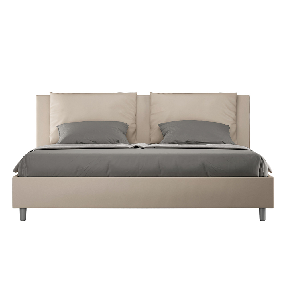 Super king size bed 200x200 cm padded made of melamine panels and covered in imitation leather , entirely Made in Italy. This super king-size bed with upholstered bed frame perfectly embodies the advantages of an upholstered bed: comfort, contemporary style, functionality, and efficient use of space . This bed, with its wide- cushioned headboard , offers a relaxing corner ideal for reading or watching TV, enhancing your bedroom. Elegant and stylish, this bed is upholstered in faux leather, making cleaning quick and easy: simply wipe it with a microfiber cloth to keep it sparkling.