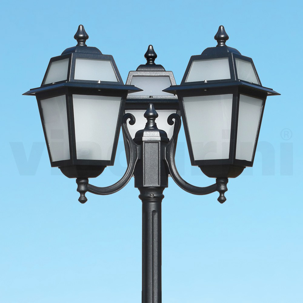 This cast aluminum street lamp with its anthracite finish is a stylish choice for any outdoor setting. With a classic and elegant design, it features crafted details that evoke an atmosphere of times gone by. The 3 lanterns, with attention to the smallest details, spread a warm and soft light, ideal for creating a luminous path in your garden or for classily delimiting an outdoor relaxation area. Solidity and beauty come together in this street lamp, designed to last over time and resist atmospheric agents. Elegant and functional , it will be the luminous signature of your outdoor space.