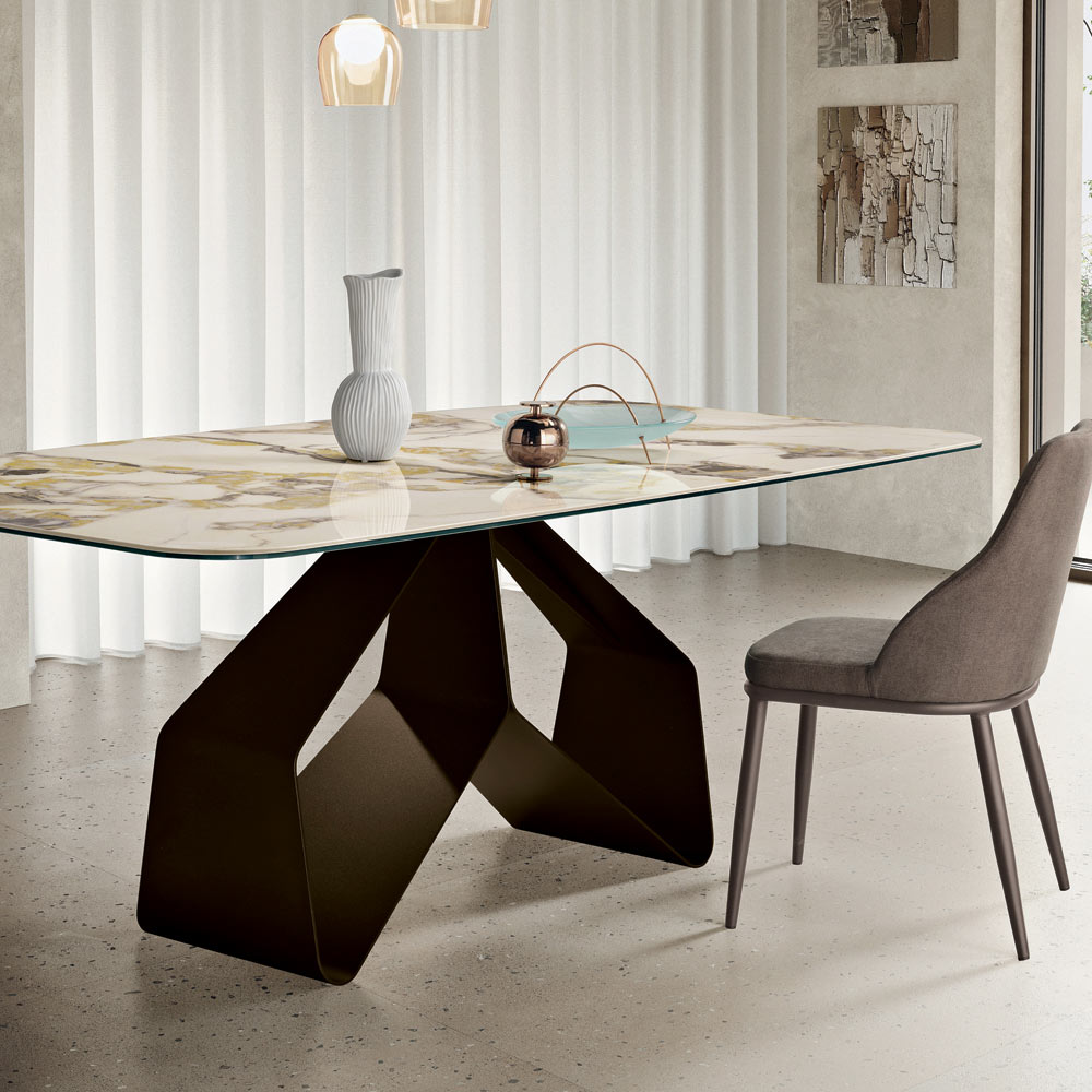 The combination of the materiality of the ceramic and the sculptural metal structure creates a perfect balance between contemporary design and functionality, making this table a protagonist of the dining area.