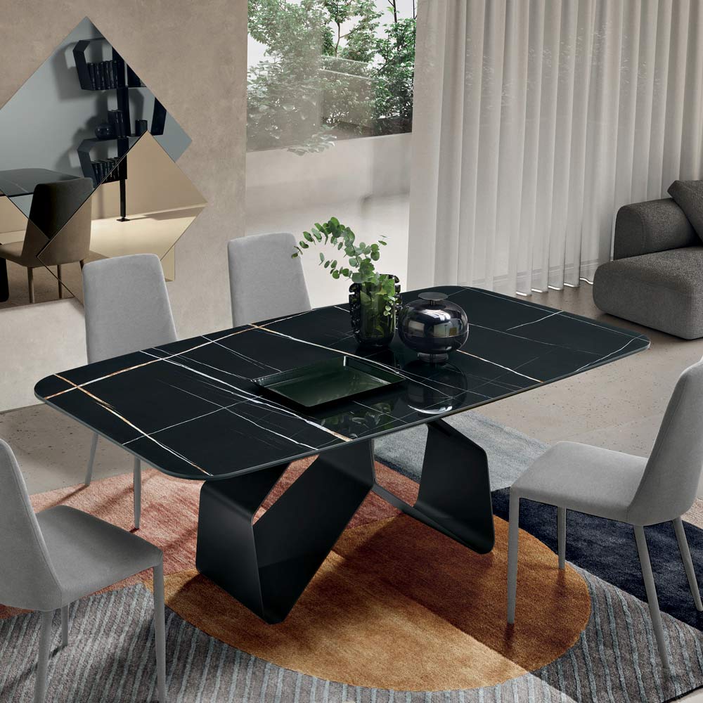 Made in Italy designer dining table with marble-effect ceramic top and sculptural painted metal base