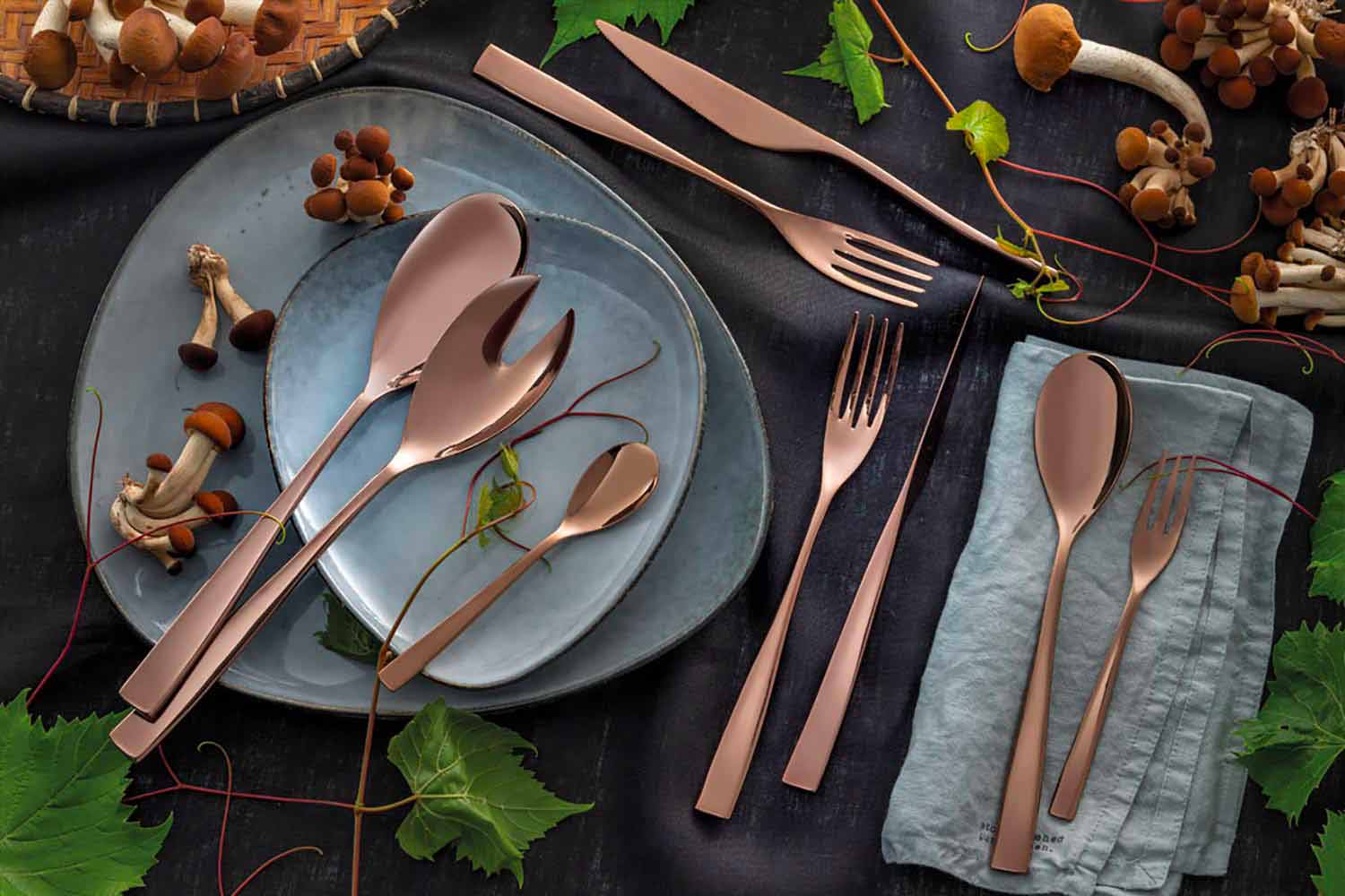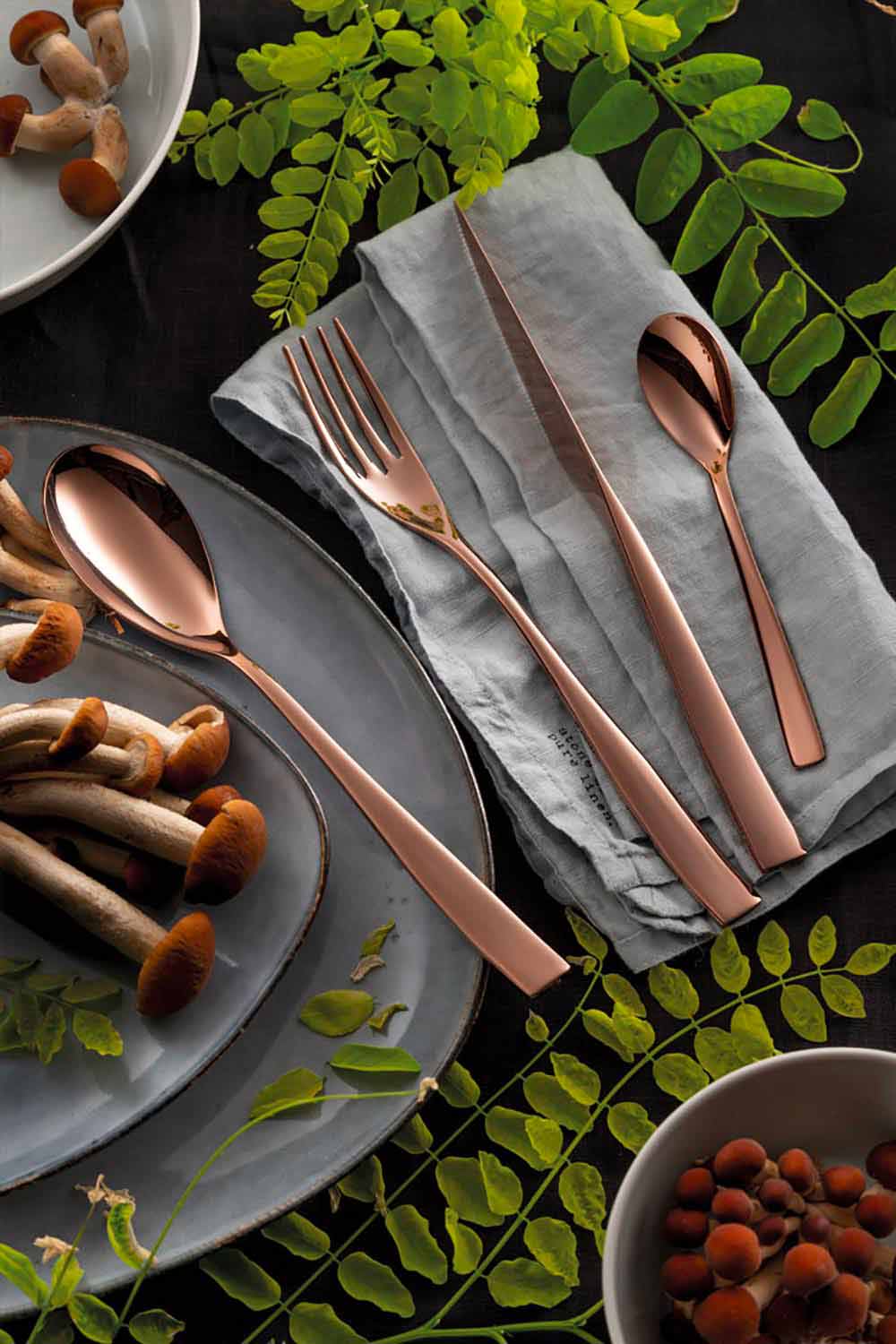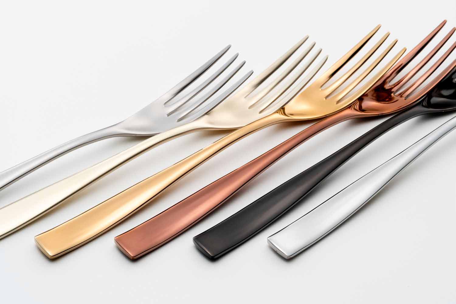 PVD is the acronym for Physical Vapor Deposition, which is a technology used to color steel in special vacuum chambers where very thin metal films are steam sprayed, which condense on the cutlery. This treatment, with a range of wonderful shades of color, in addition to embellishing the cutlery, makes them more