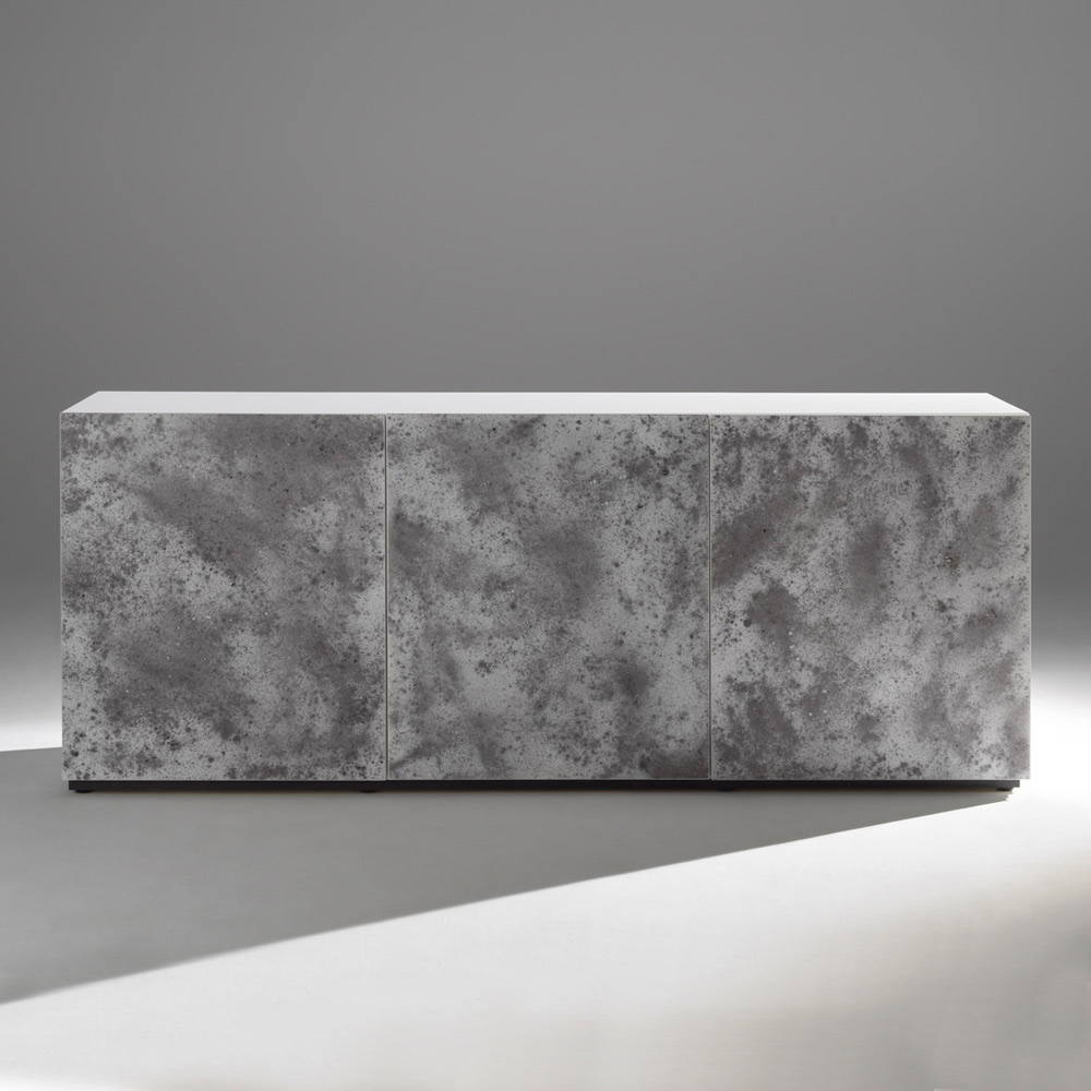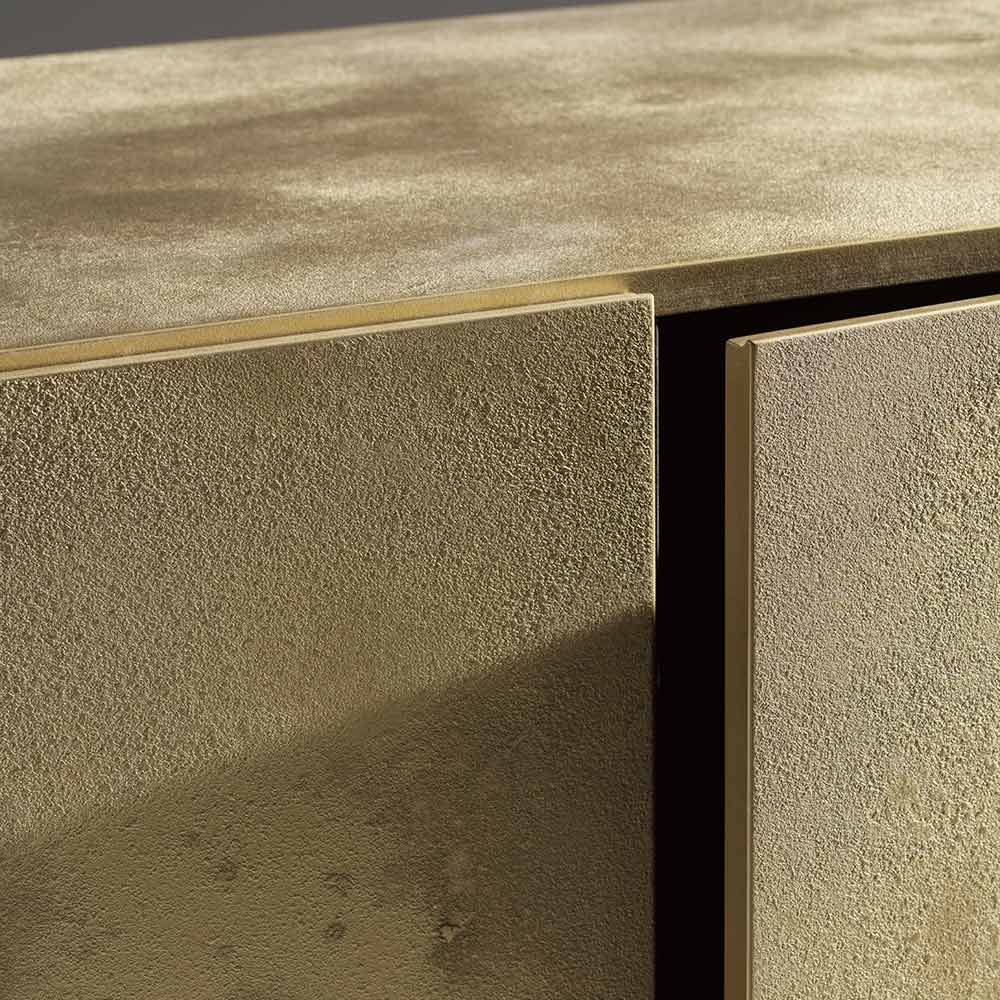 A sideboard with a minimalist, contemporary design, featuring pure volumes and sophisticated textured surfaces. A dramatic and functional piece, ideal for living rooms, dining rooms, and contract spaces with a modern, sophisticated feel.