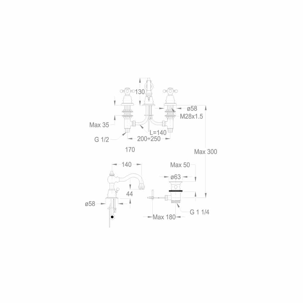 Classic design three-hole countertop washbasin mixer in chrome finish brass 130 mm high and with a 140 mm center distance with drain and pop-up lever.