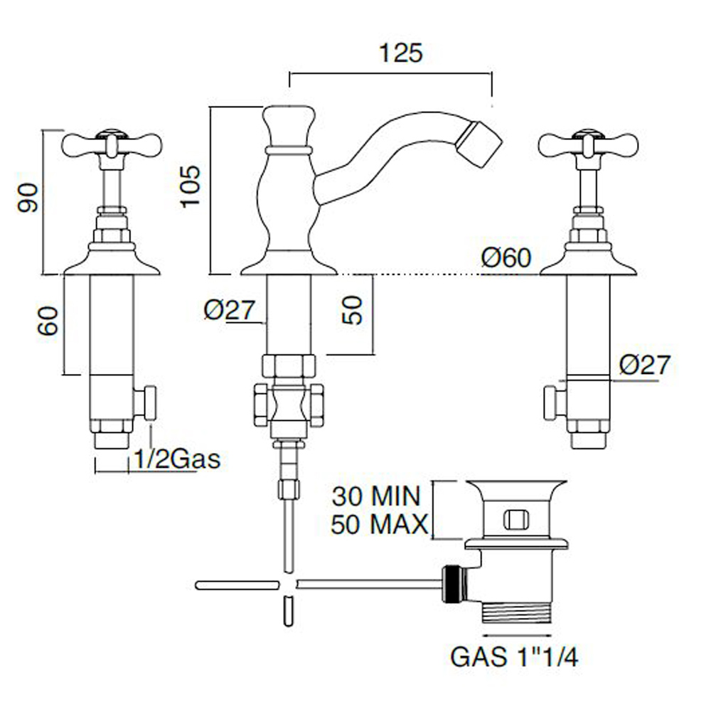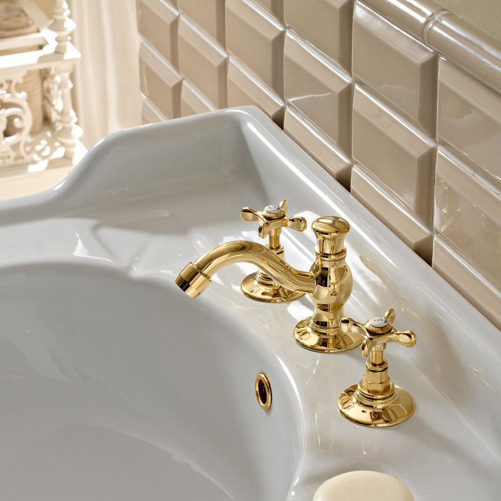 Classic 3-hole basin faucet made of handcrafted brass made in Italy.