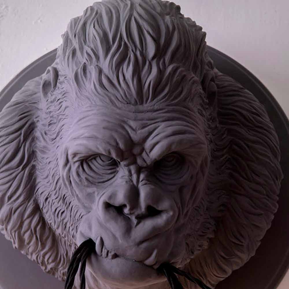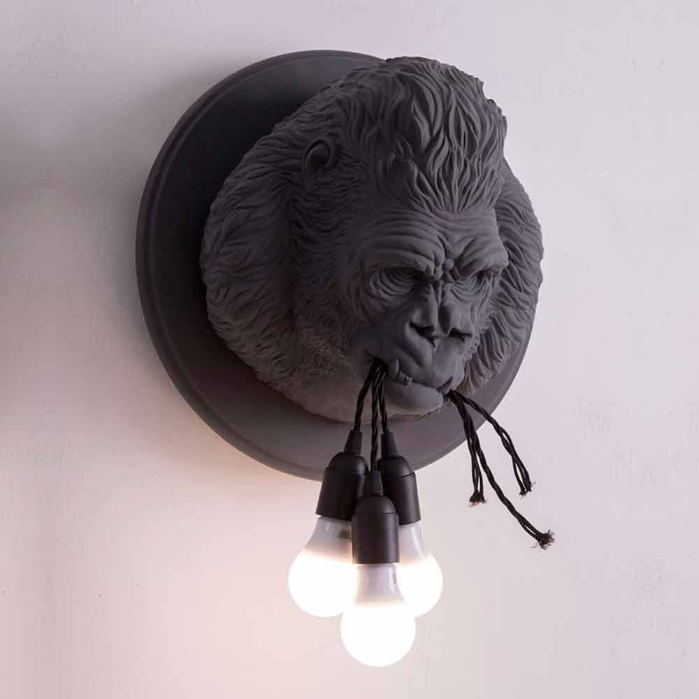 Wall lamp in white or gray ceramic in the shape of a gorilla, handmade product made in Italy.