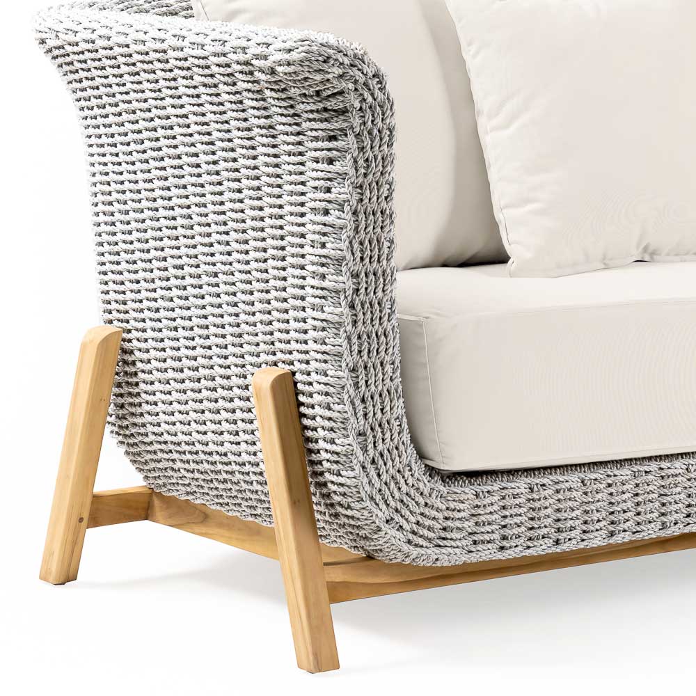 This outdoor sofa is made with an internal structure in epoxy powder coated aluminum frame , with teak base and hand-woven VRO rope insert. It is complete with seat and back cushions in water-repellent havana grey fabric.