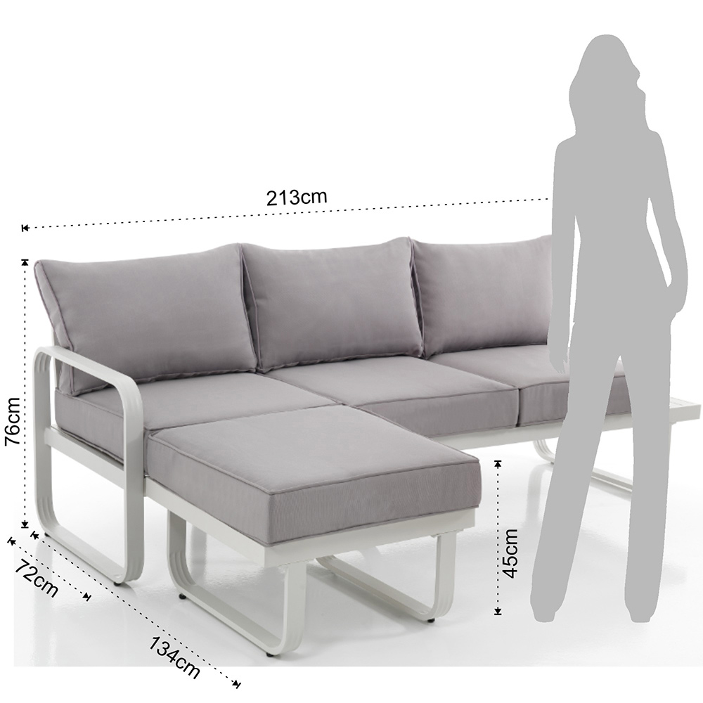 Dimensions:- sofa: length: 213 cm x depth: 72 cm (with attached pouf 134 cm) x height: 76 cm