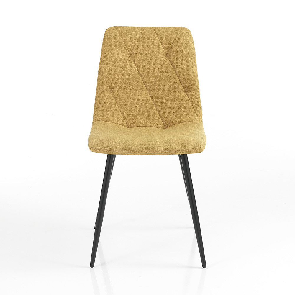 The design is enhanced by a quilted diamond pattern on the backrest, which not only increases comfort but also adds a visual element of texture and depth, giving the chair a sophisticated and modern look. The black metal legs are thin but sturdy, offering a solid base and a nice contrast to the seat fabric.