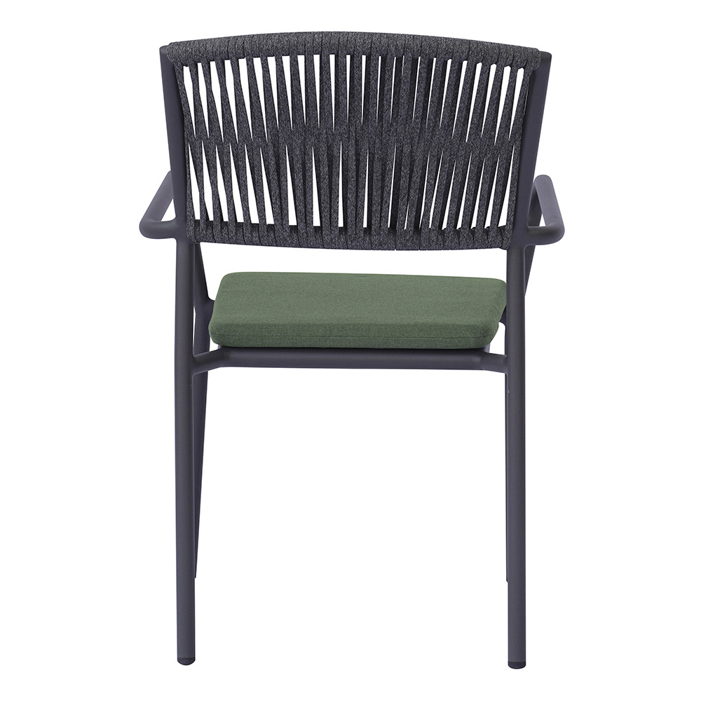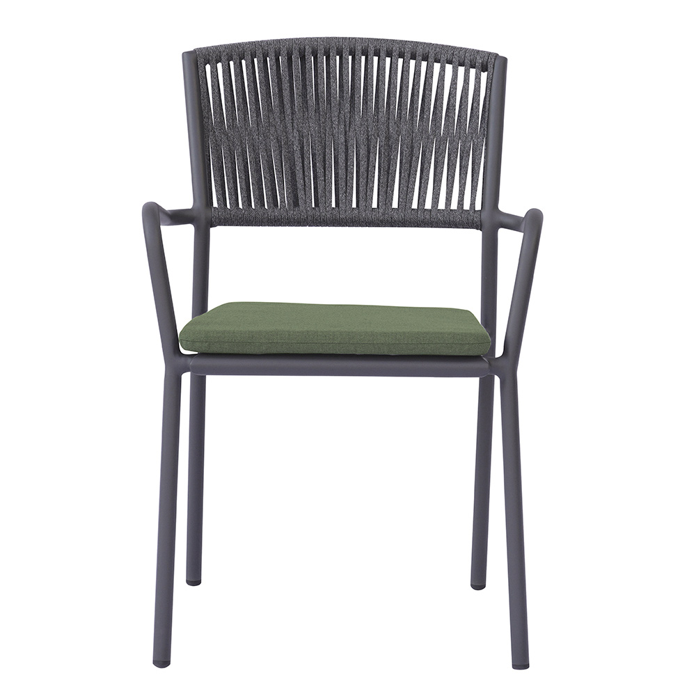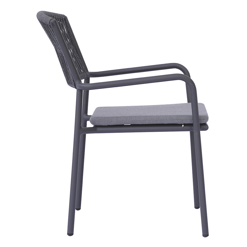 The outdoor rope backrest adds a refined, contemporary touch, ensuring comfort and breathability, while the aluminum seat with matching cushion offers softness and comfort, making every moment of relaxation even more enjoyable.