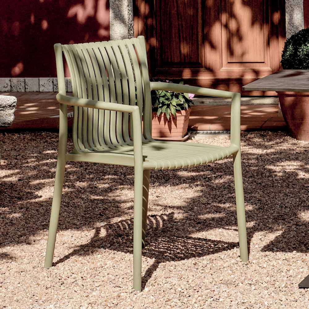 The material is UV-resistant , ensuring vibrant colors and unaltered surfaces even after prolonged exposure to the sun. With a modern, linear design , this chair easily adapts to a variety of settings—from gardens to terraces, to contract spaces like bistros and hotels.
