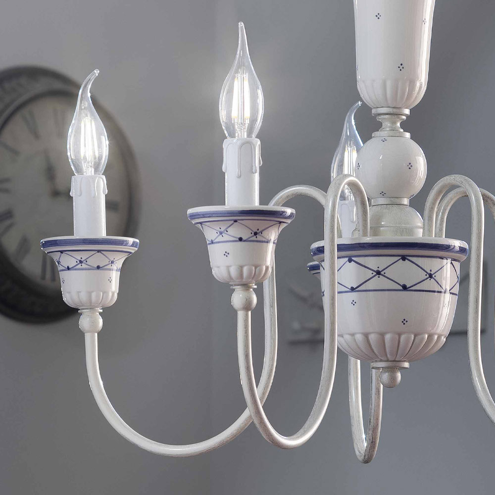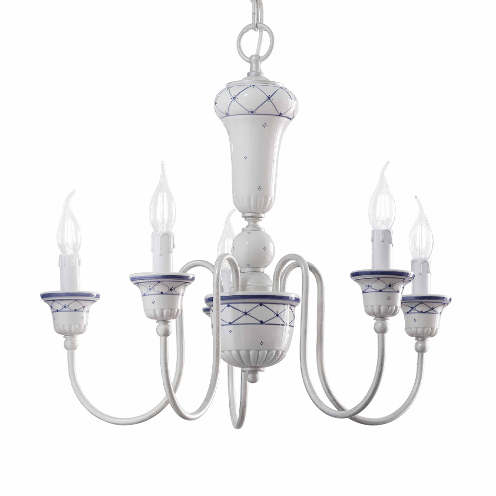 This 5-light chandelier is entirely handcrafted in painted brass and ceramic with hand-painted floral decoration, Ā to highlight the skill and manual skills of the artisans.