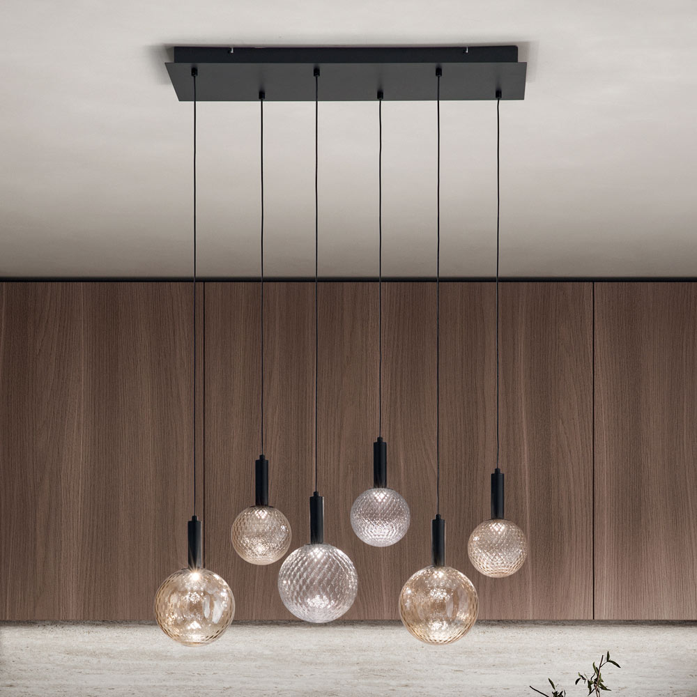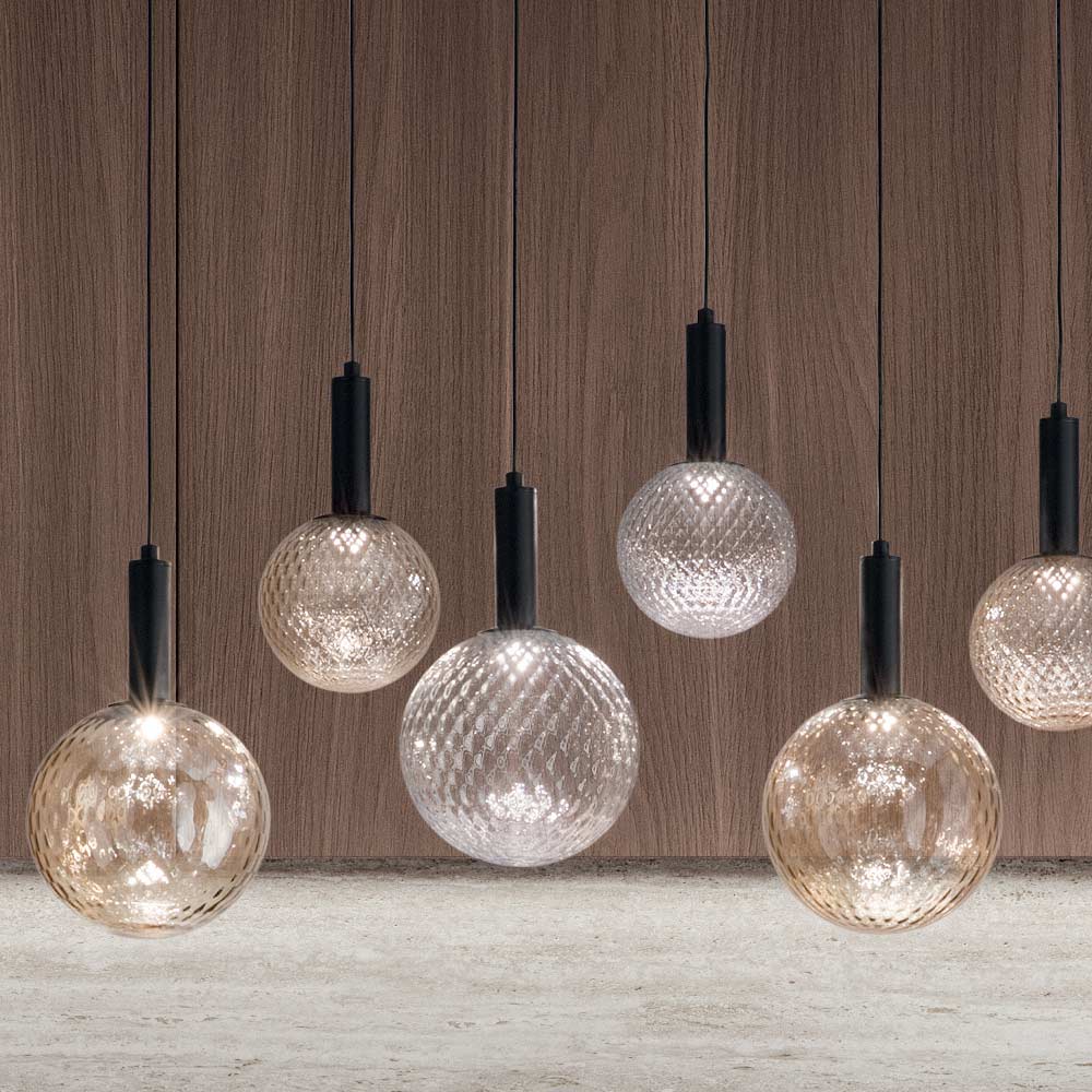 Perfect above a dining table or as a focal point in a contemporary living room , each sphere is hung with precision, creating a composition that is as artistic as it is functional . The different glass tone finishes add a touch of class and distinction to any space, reflecting light in ways that catch the eye and illuminate the room.
