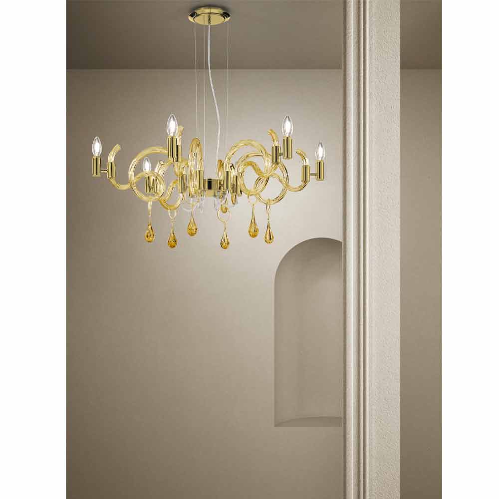 Refined 6-light chandelier handmade in Italy in amber-finish Venetian glass with details in shiny golden metal . The skilled craftsmanship blends with contemporary elements to give life to an original evolution of glass capable of completing modern spaces as well as classic style environments with its strong decorative value. The wonderful touch given by the hanging drops creates the illusion of real rain thus increasing the aesthetic side of the wonderful product thanks to its scenographic personality .
