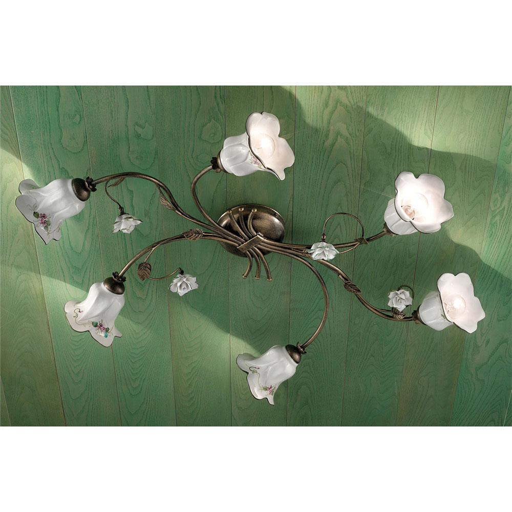 6-lumen ceiling lamp in metal and ceramic with hand-painted roses made in Italy by Ferroluce.