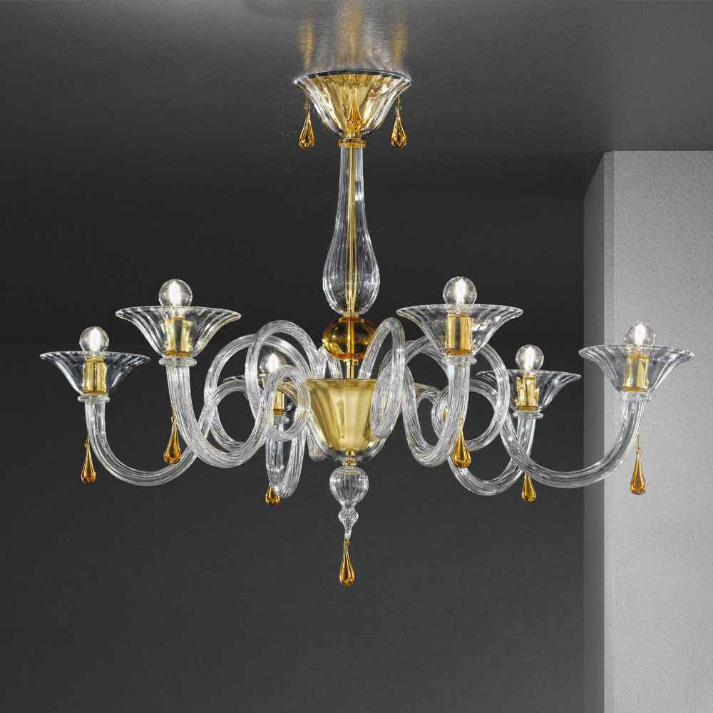Elegant and refined chandelier with a classic design handcrafted in Italy in colored glass of Venice with crystal and amber finish with details in shiny golden metal . Traditional lines that evolve to give life to a versatile style , also suitable for large spaces with modern furnishings in which to play with contrasts for a unique and exclusive lighting . Its rigorous elegance is marked by balance and symmetry , elements that give the aesthetics of the chandelier its imposing personality and its high value . The design is enriched by the unprecedented shape of the arms modeled during the processing of the blown glass for a creative and fascinating result .