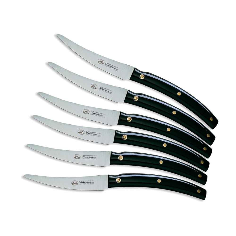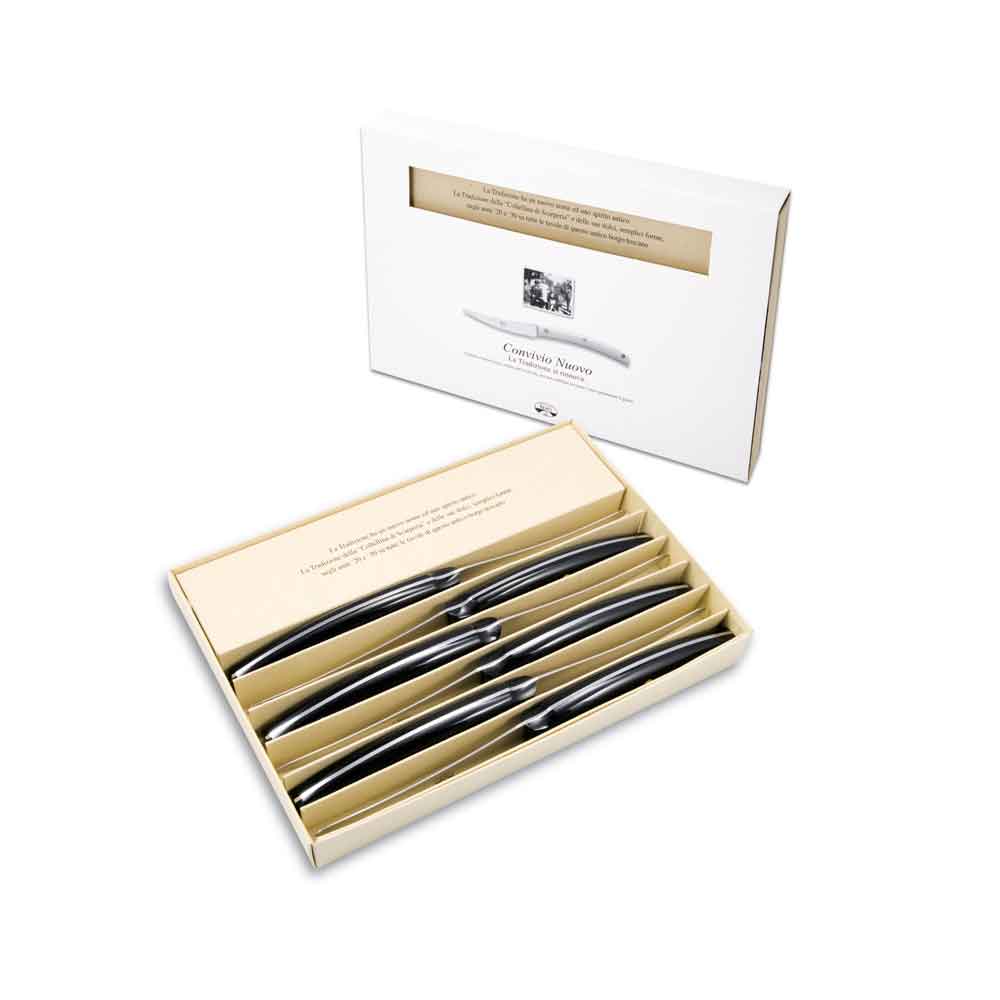 Table knife: often the most neglected in the choice must be strictly smooth in order not to weaken the meat and not to squeeze the taste, as happens with serrated blades. To savor dishes in their full flavor, with a sweet and precise cut. You won't have to throw it away once it has lost its edge, as with serrated blades, which cannot be sharpened.