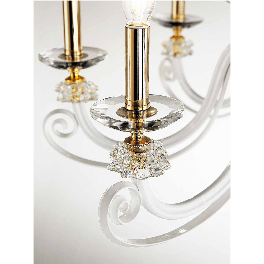 The 8-light chandelier is a luxury lighting accessory entirely handmade in Italy with a structure with metallic finishes combined with blown glass and high quality optical crystal.