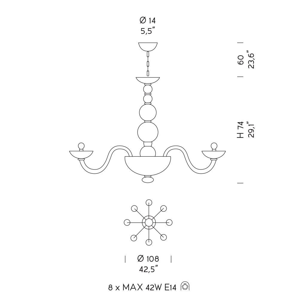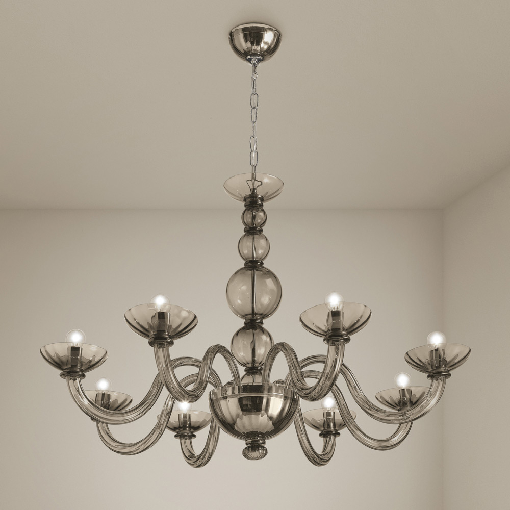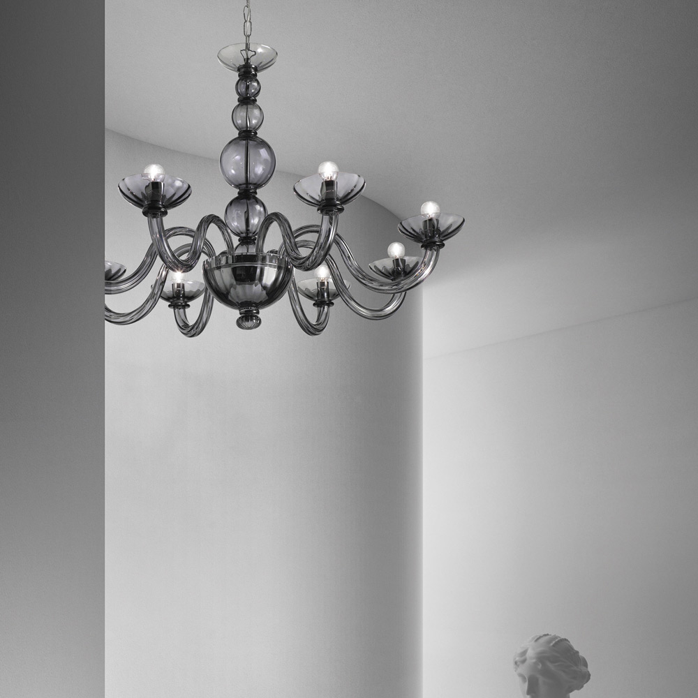 refined curves that adapt perfectly to classic environments but at the same time also to spaces with a contemporary style. The element of tradition is punctuated by its marvelous components in entirely hand-made blown glass which is transformed to update itself thanks to trendy colors. Its