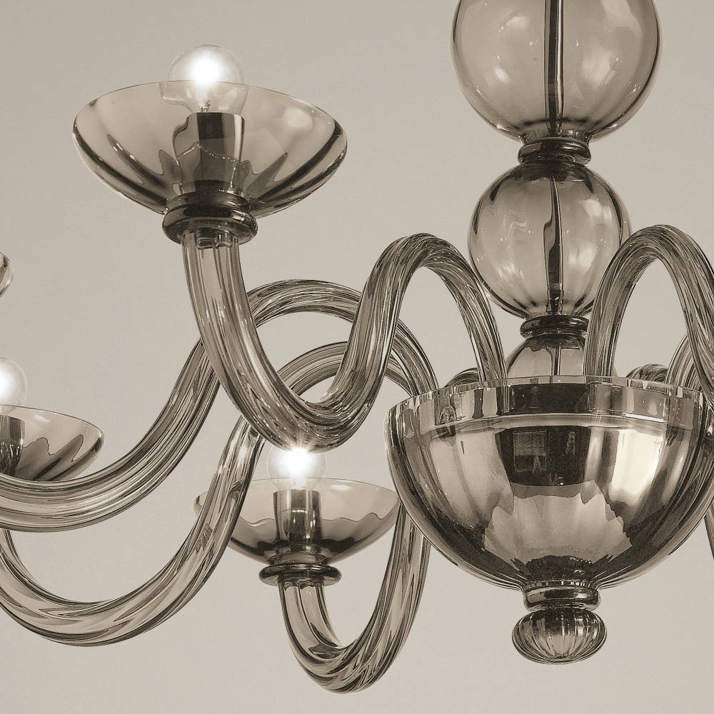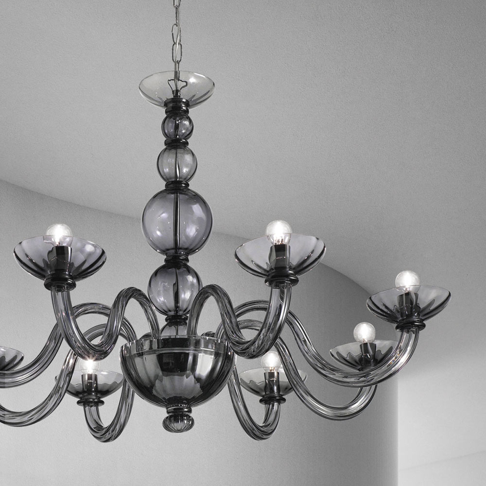 Venetian glass 8-light chandelier with polished chromed metal details. A piece of furniture with an amazing and iconic presence characterized by a