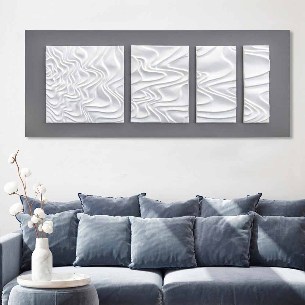 wall installation in composite ceramic is made up of four elements with elegant lines and modern shapes in ivory white mounted on a canvas frame lacquered quartz gray.