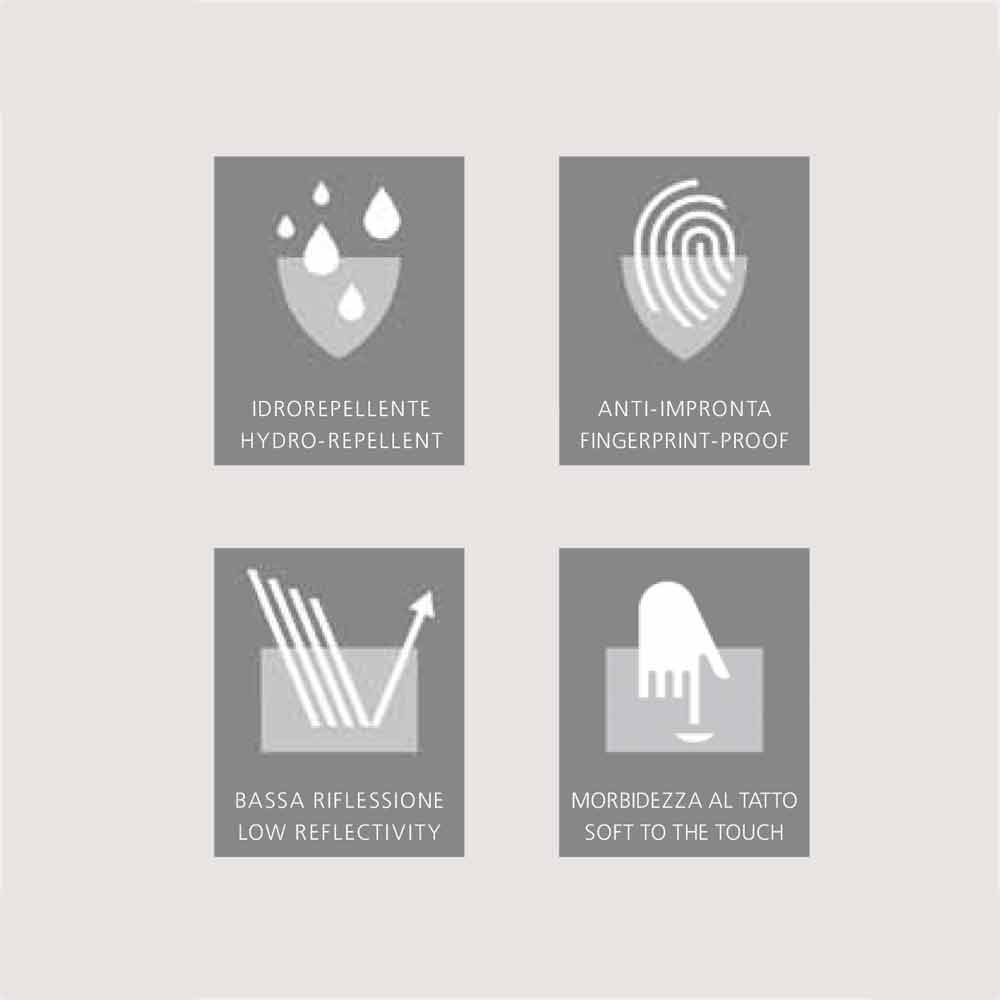 The cabinet frame is made of Fenix, a polymeric material treated using nanotechnological techniques, which makes the surface waterproof, stain repellent and with a soft-touch effect.