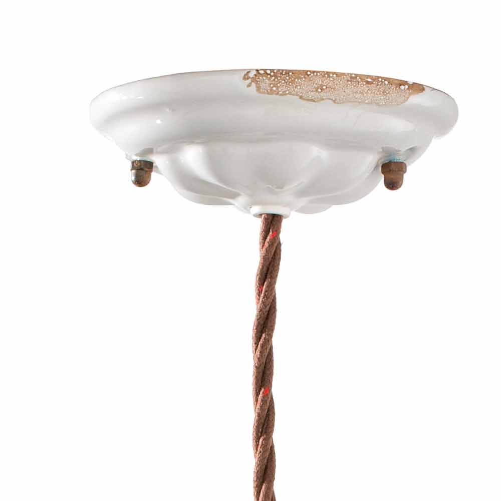 The peculiarity of this lamp lies in the craftsmanship of the ceramic. The ceramic, in fact, is decorated in such a way as if time had marked its path. The reproduction of the erosion of time combined with the shiny surfaces give that extra value to this suspension. This time-worn effect gives Alayna a sophisticated vintage-industrial style.