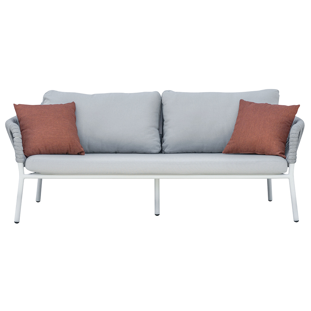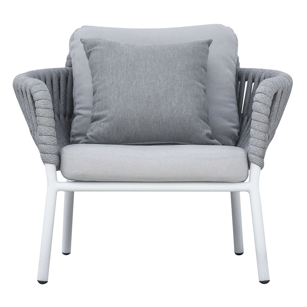 Outdoor lounge set including 2 armchairs and a three-seater sofa made with a white aluminum frame and light gray rope with removable light gray cushions and decorative brick and gray pillows. Also included is a coffee table with a concrete-effect ceramic glass top and a white aluminum frame.