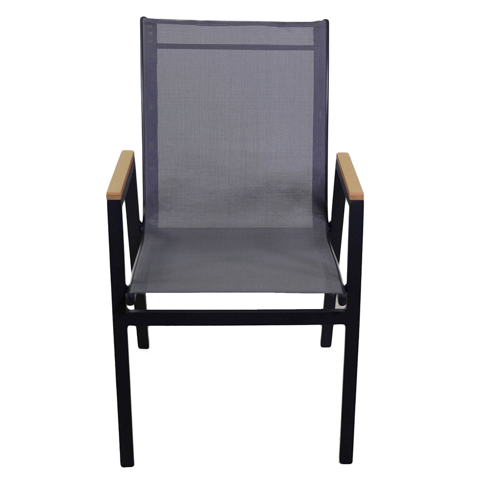 This powder-coated aluminum frame armchair combines style and functionality, perfect for completing any modern outdoor space. The textilene fabric ensures resistance to the elements and long-lasting comfort, while the wooden inserts on the armrests add a touch of warmth and elegance.