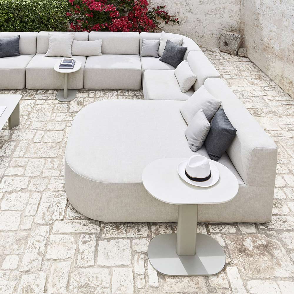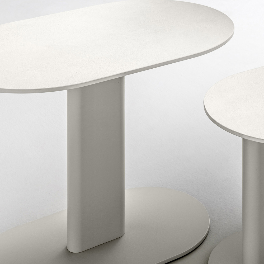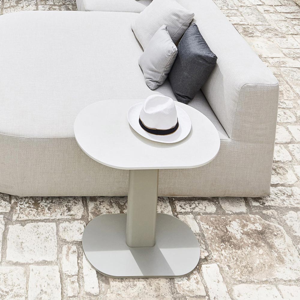 Garden coffee table composed of an aluminum structure resting on a steel base with a protective cycle in silk gray and a lime-white HPL top , made in Italy. Thanks to its linear, clean and functional design, this coffee table is perfect for decorating outdoor environments such as terraces, swimming pools and gardens, while also finding its place in the various indoor living areas.