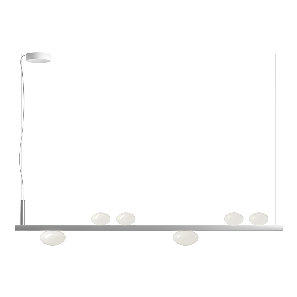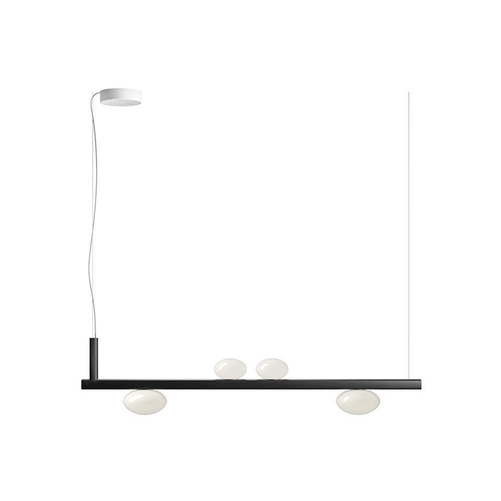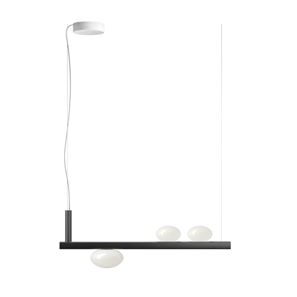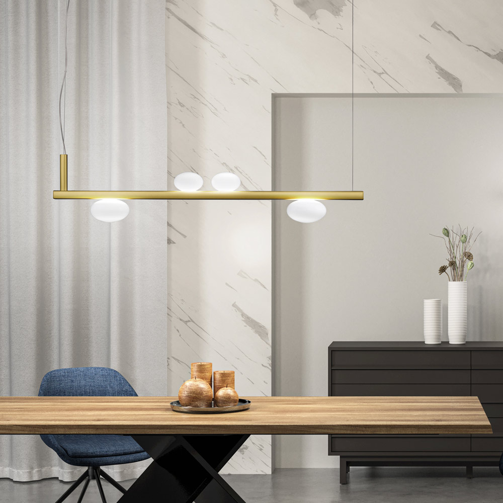 This pendant lamp is a true icon of intelligent design and discreet technology . Its clean, linear structure is paired with elegant spherical opal glass diffusers, which appear to be suspended in balance, creating a modern and light visual effect.