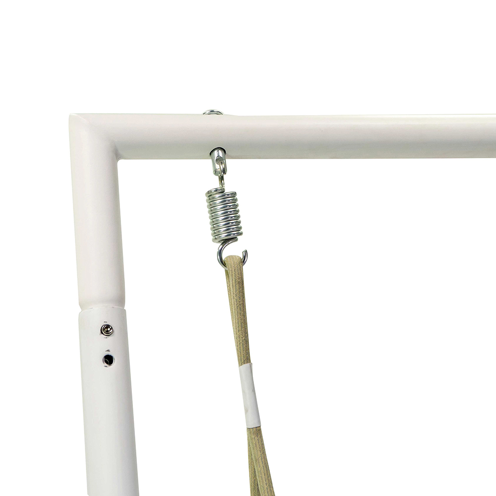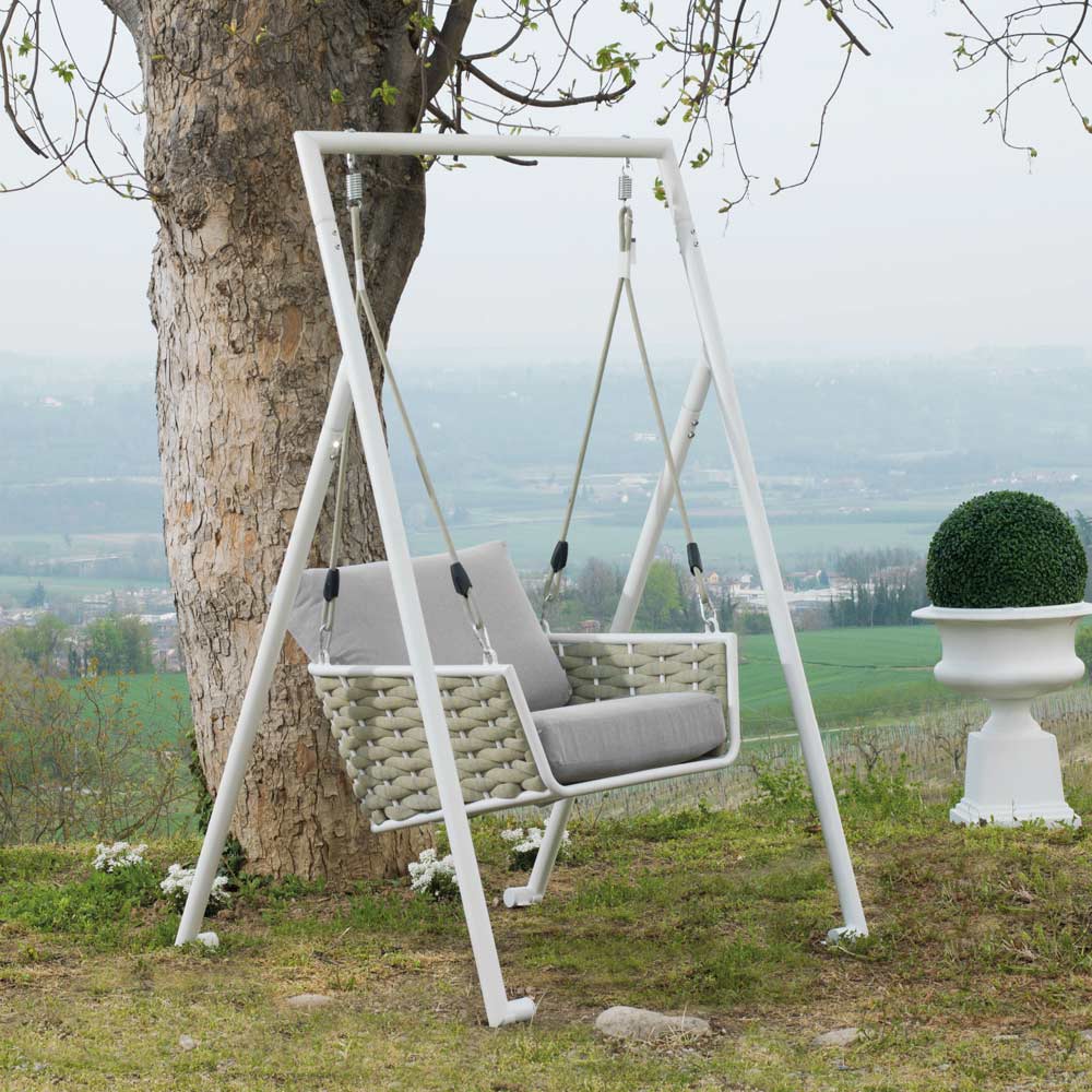 The swing is completed with thick and comfortable cushions in water-repellent fabric, which invite long afternoons of reading or serene coffee breaks. The modern and minimalist design, accentuated by the clean lines of the white structure, fits perfectly into any outdoor environment, adding a touch of contemporary style .