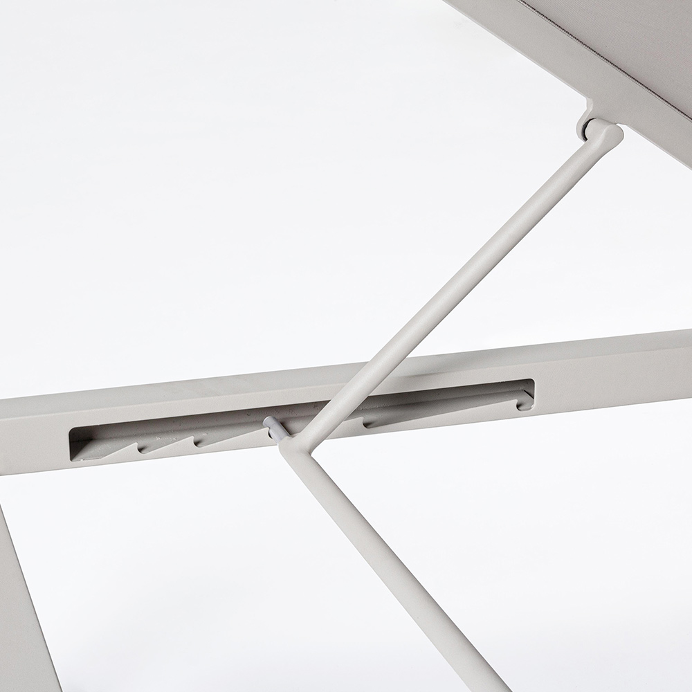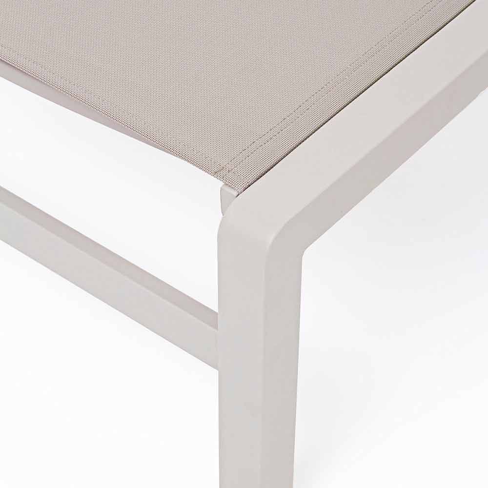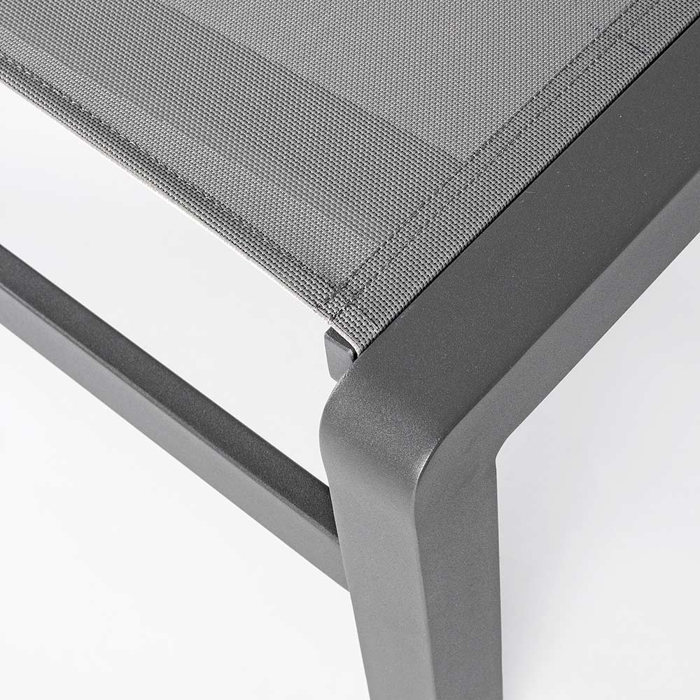 coated aluminum structure (polyester). Seat and back in 1x1 textilene. Plastic wheels and stainless steel screws. Reclining backrest (6 positions). Stackable.