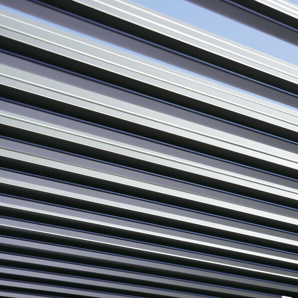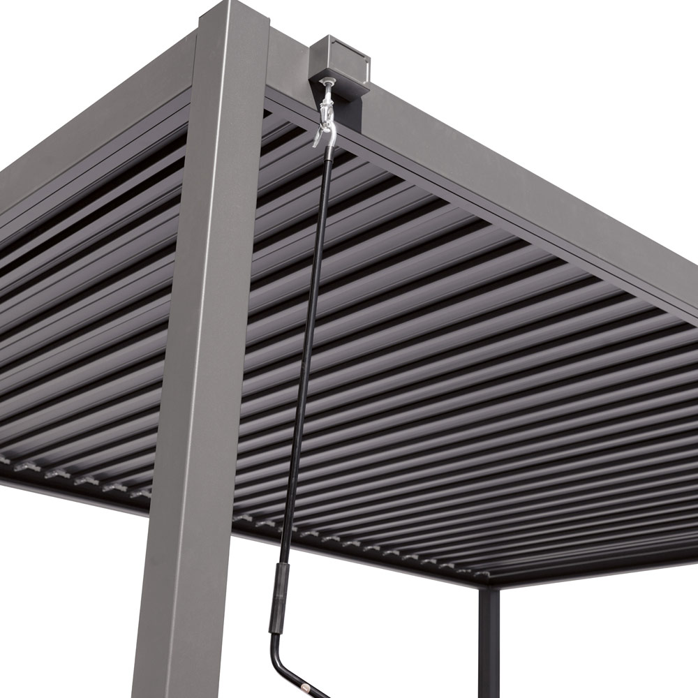 The 90 x 90 mm aluminum support posts and 120 x 30 mm / 147 x 30 mm roof crosspieces provide a solid and reliable structure. The adjustable louvered roof , operated via an external steel crank , allows you to easily adjust the light entry and ventilation, creating the ideal environment at any time of the day.